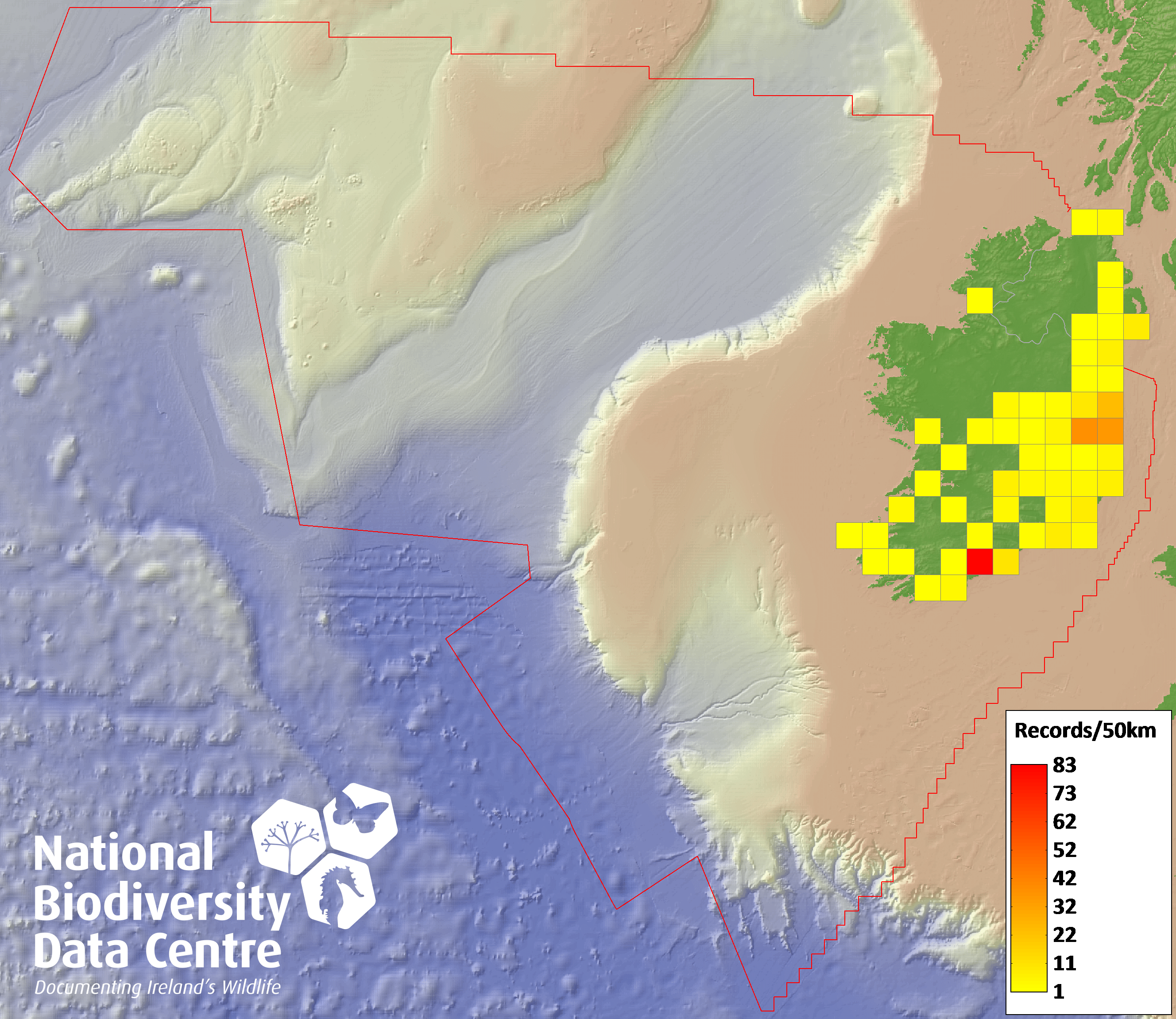 Distribution of the number of records recorded within each 10km grid square (ITM).Marine Map - 50km