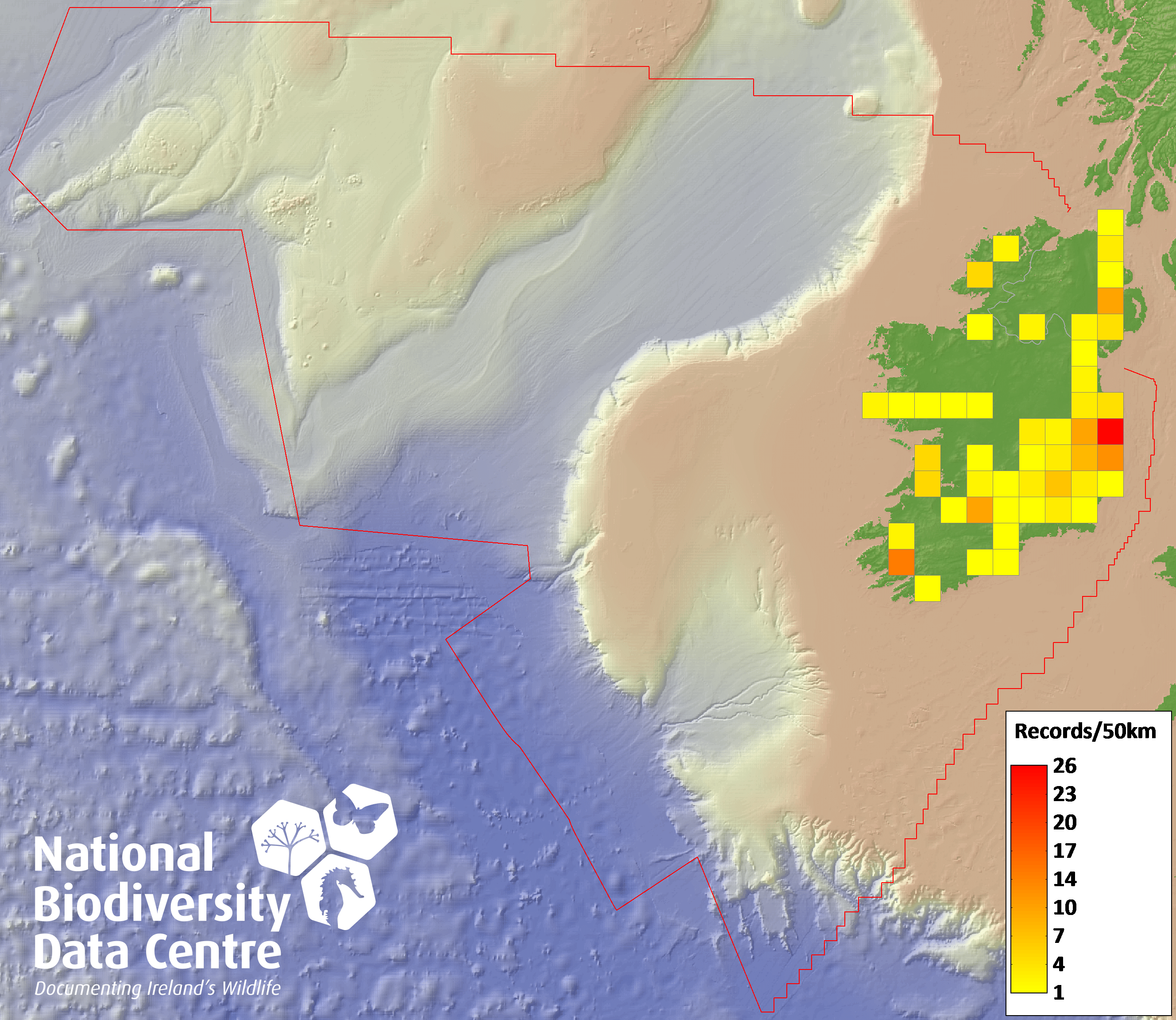 Distribution of the number of records recorded within each 10km grid square (ITM).Marine Map - 50km