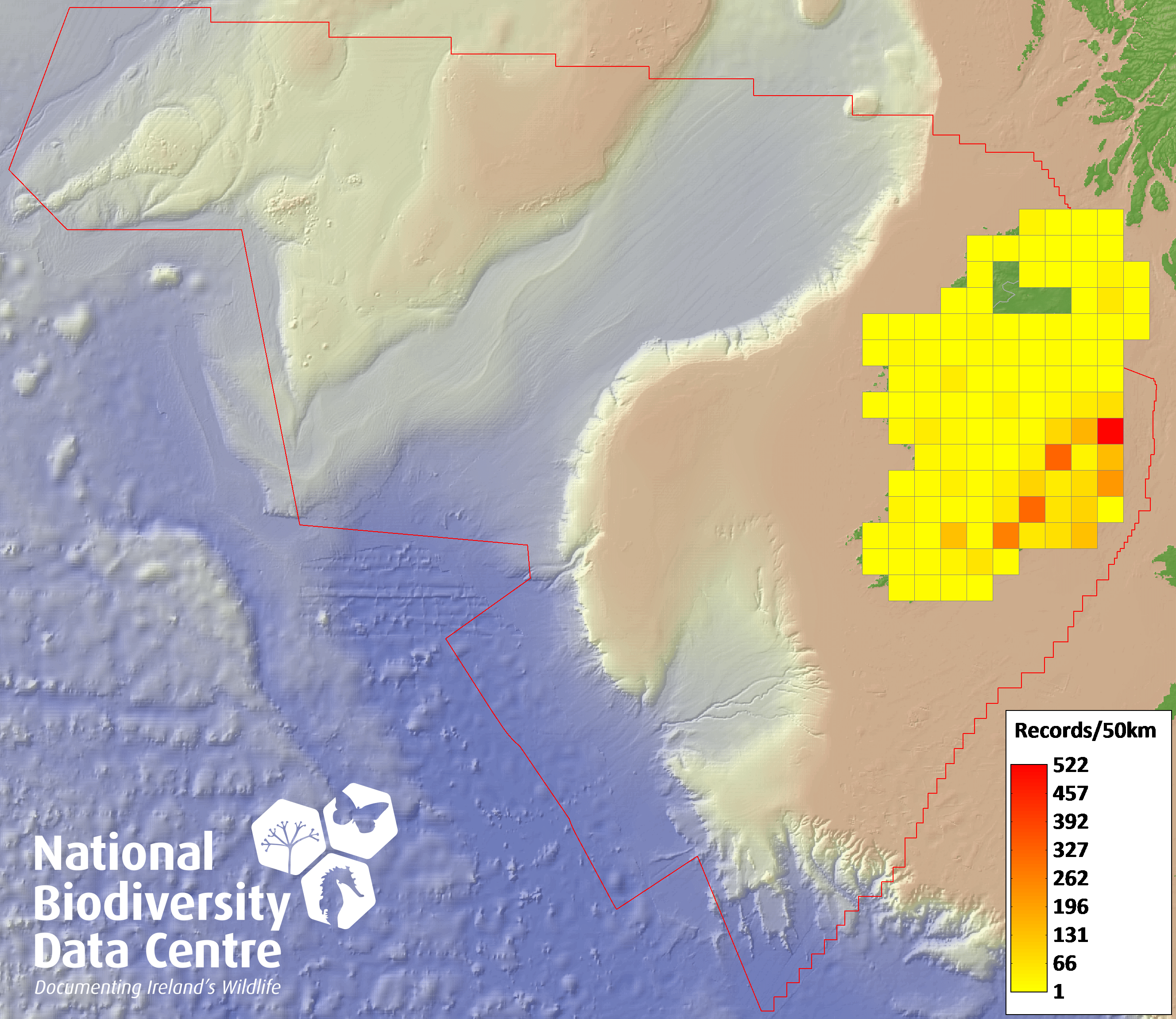 Distribution of the number of records recorded within each 10km grid square (ITM).Marine Map - 50km