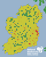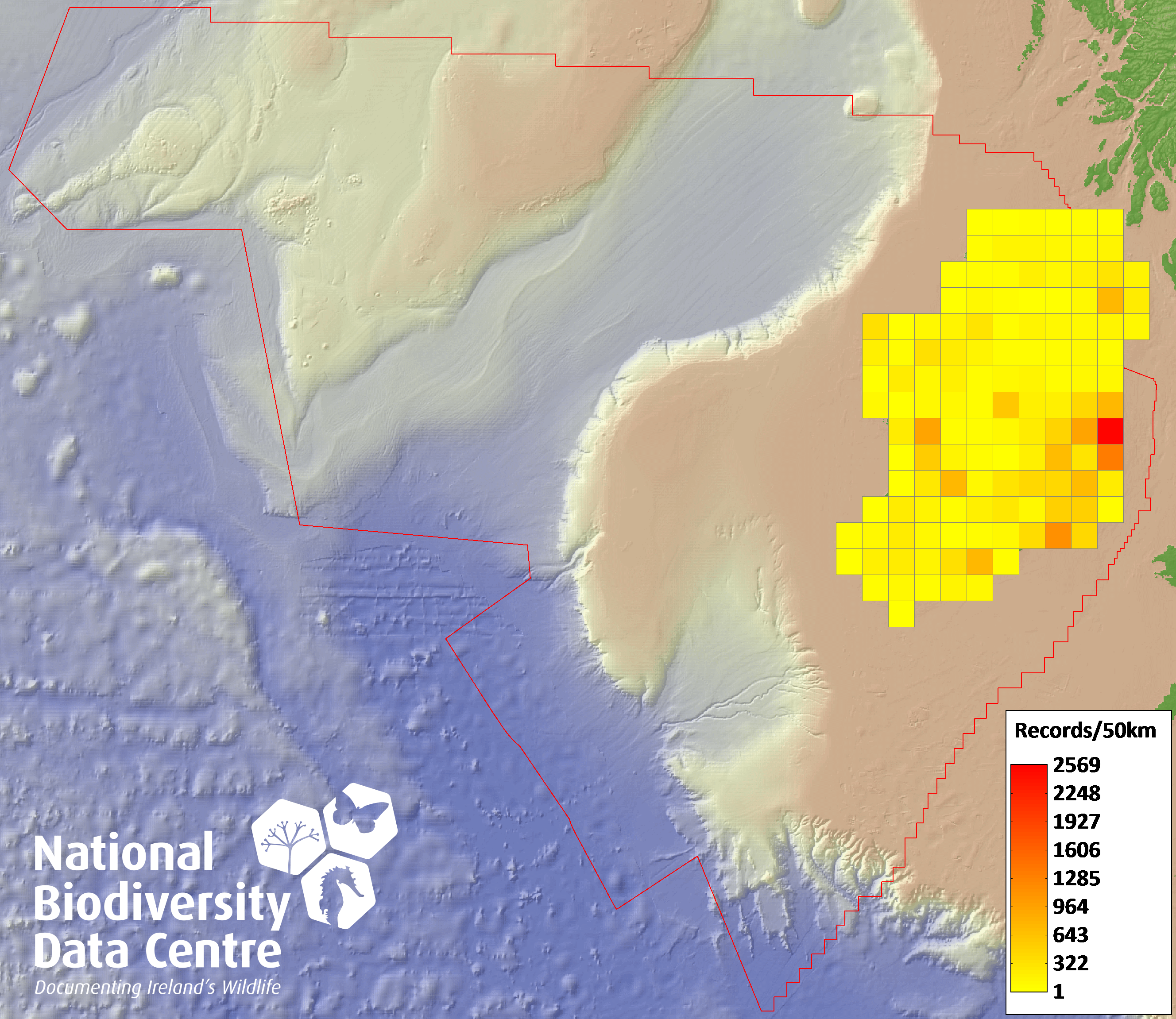 Distribution of the number of records recorded within each 10km grid square (ITM).Marine Map - 50km