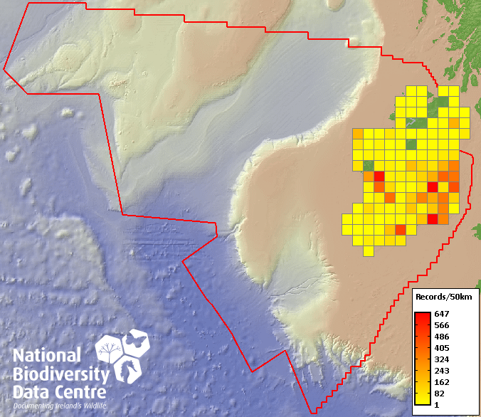 Distribution of the number of records recorded within each 10km grid square (ITM).Marine Map - 50km