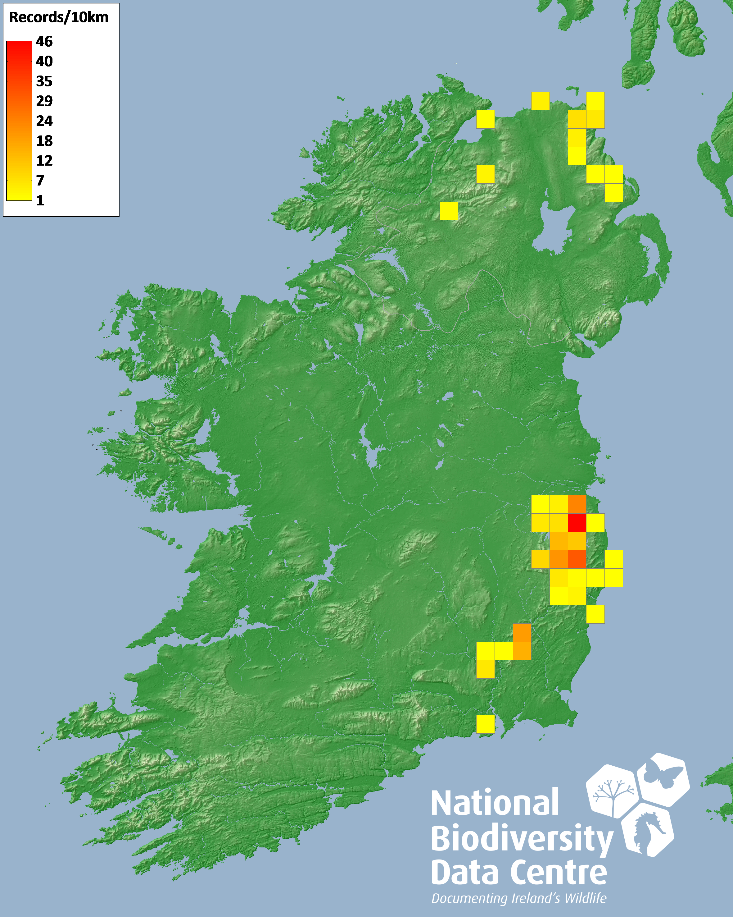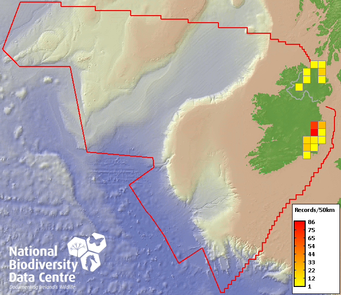 Distribution of the number of records recorded within each 10km grid square (ITM).Marine Map - 50km
