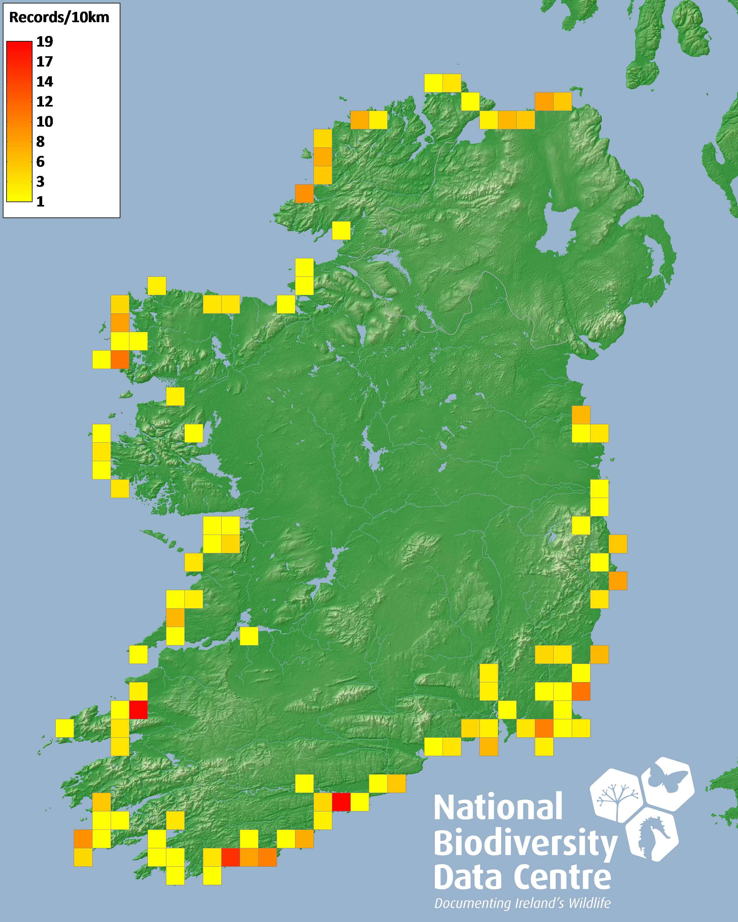 Distribution of the number of records recorded within each 10km grid square (ITM).Marine Map - 50km