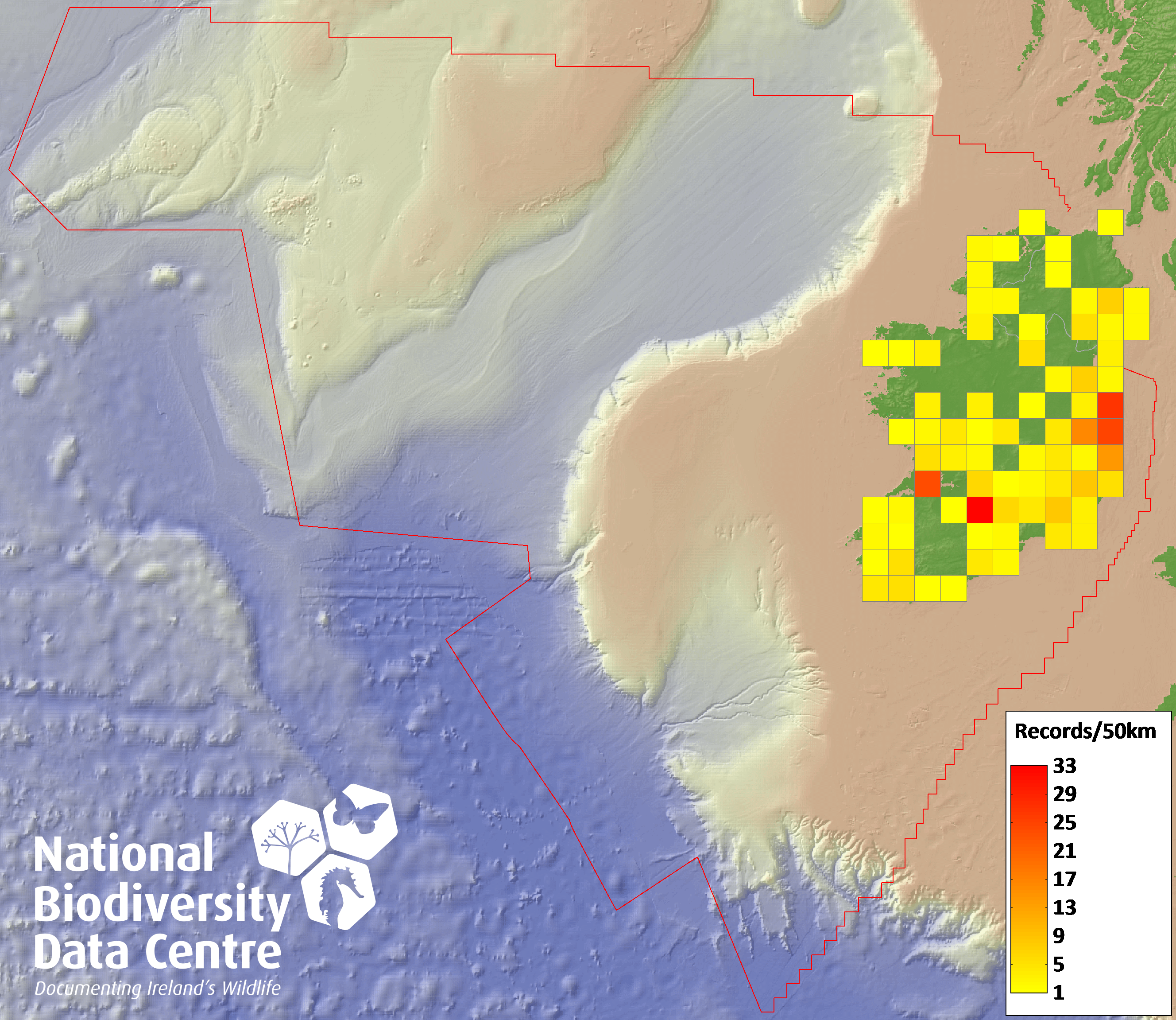 Distribution of the number of records recorded within each 10km grid square (ITM).Marine Map - 50km