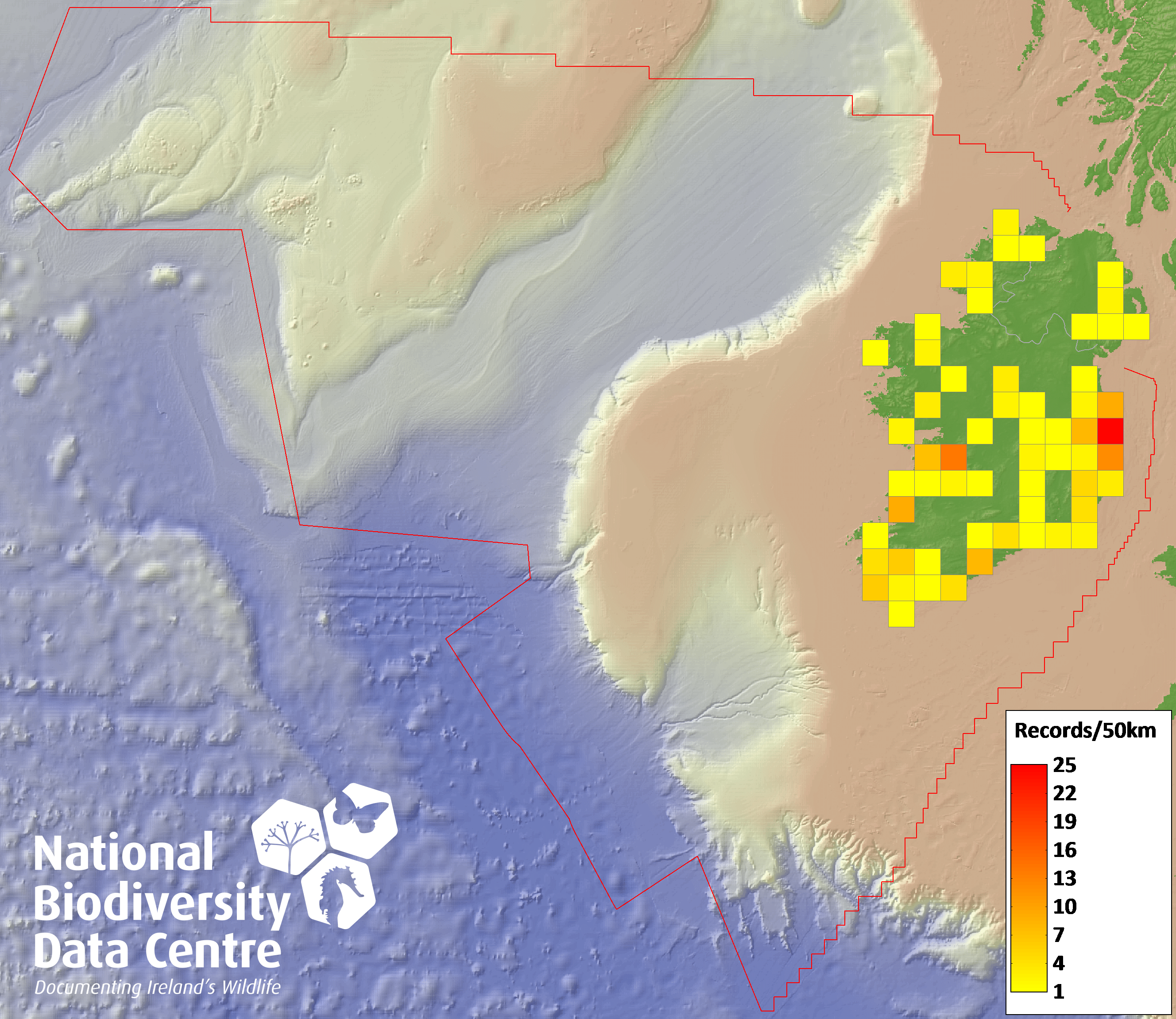 Distribution of the number of records recorded within each 10km grid square (ITM).Marine Map - 50km