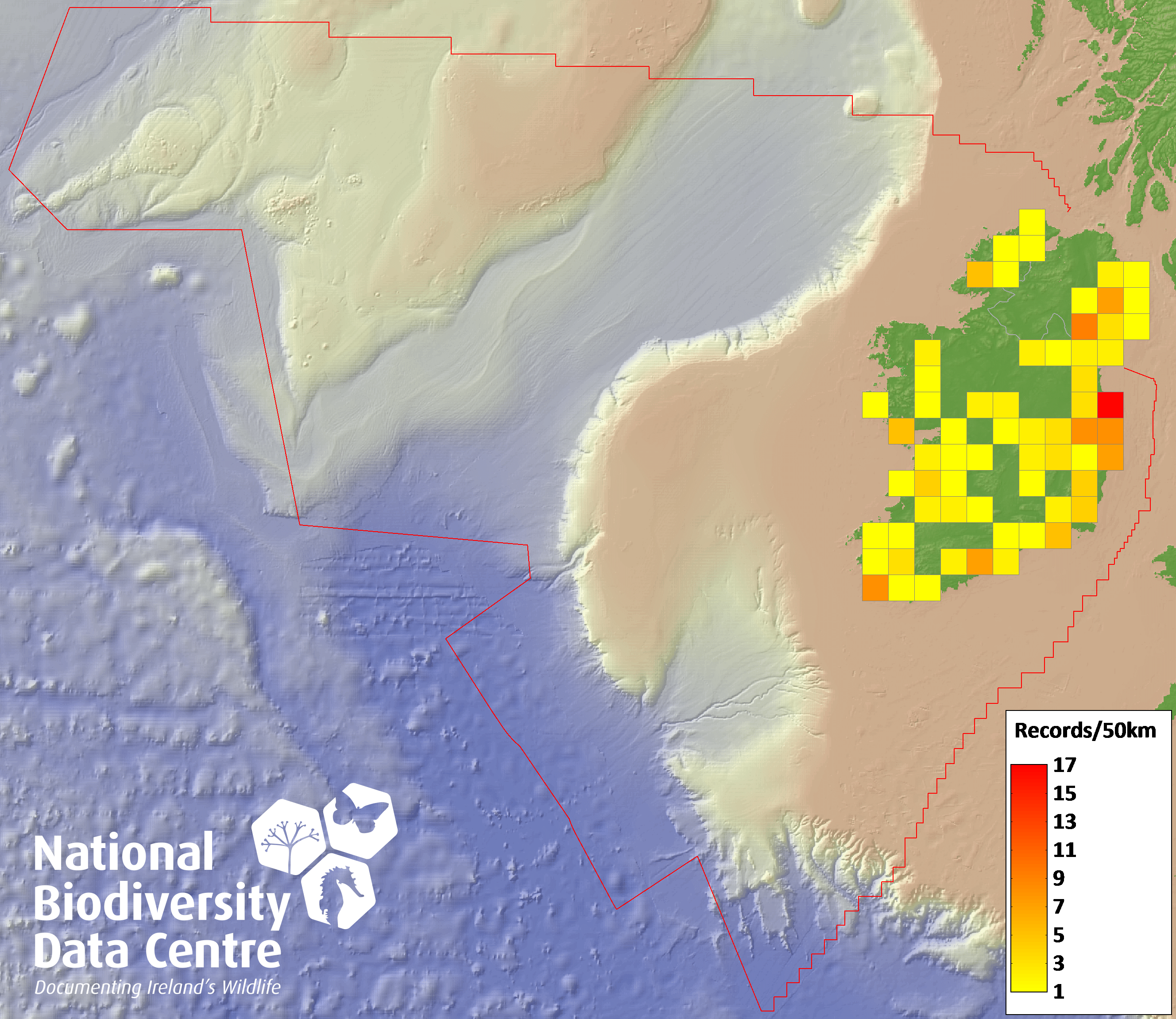Distribution of the number of records recorded within each 10km grid square (ITM).Marine Map - 50km