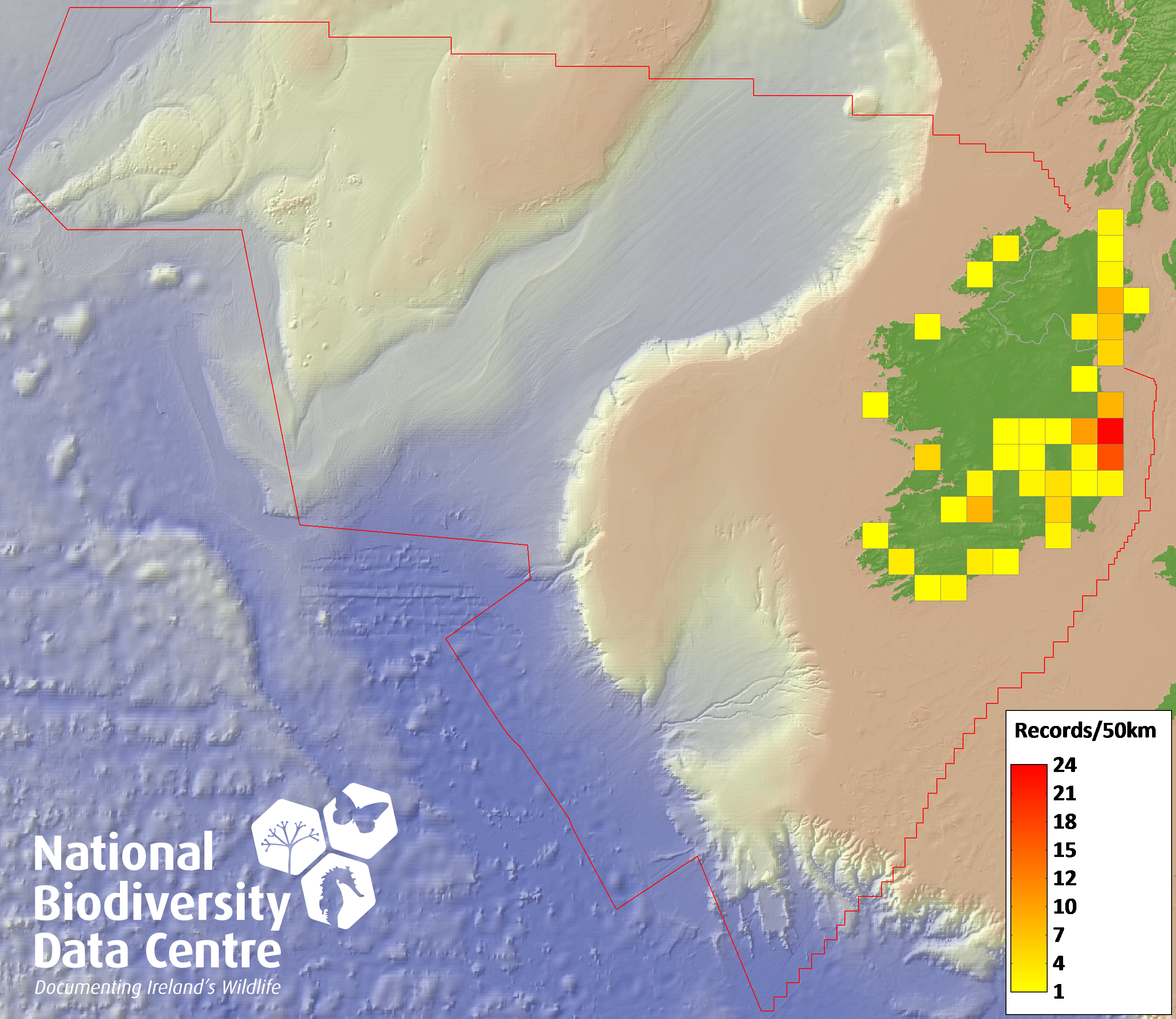 Distribution of the number of records recorded within each 10km grid square (ITM).Marine Map - 50km