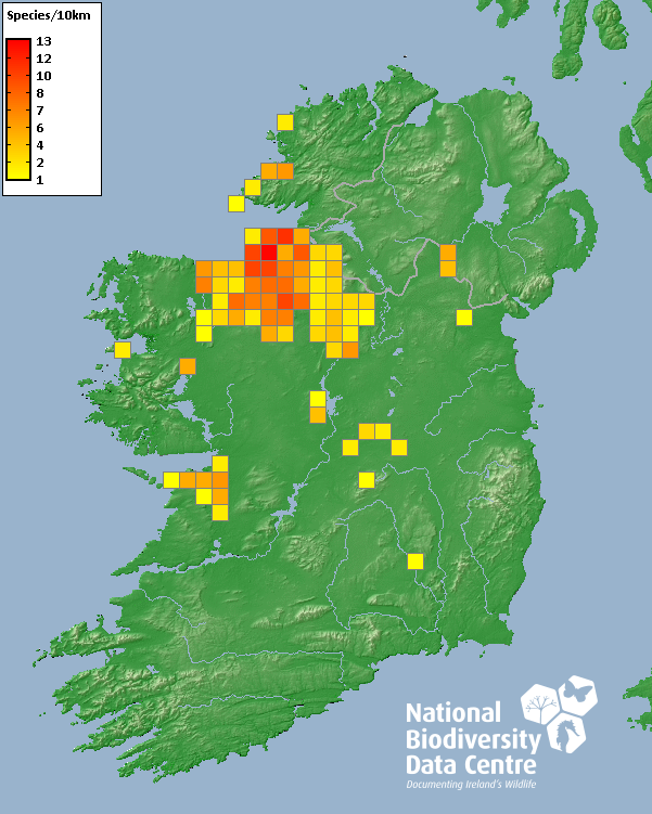 Distribution of the number of species recorded within each 10km grid square (ITM).Marine Map - 50Km