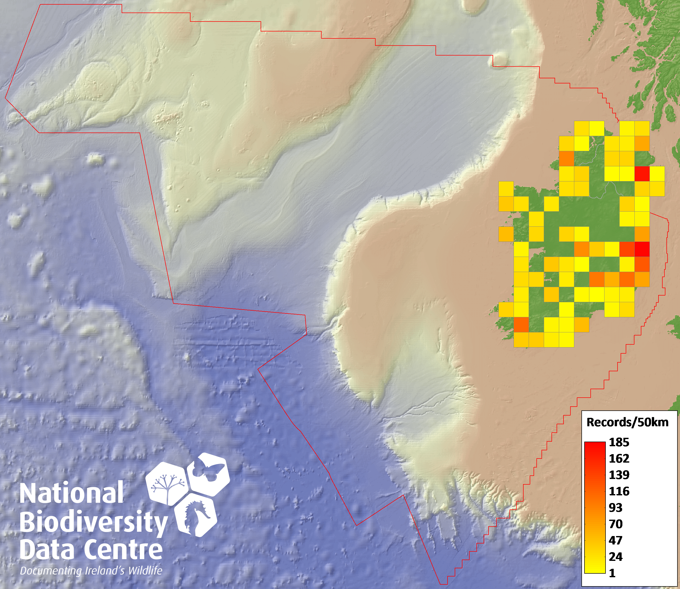 Distribution of the number of records within each 10km grid square (ITM).Marine Map - 50Km