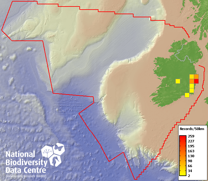Distribution of the number of records within each 10km grid square (ITM).Marine Map - 50Km