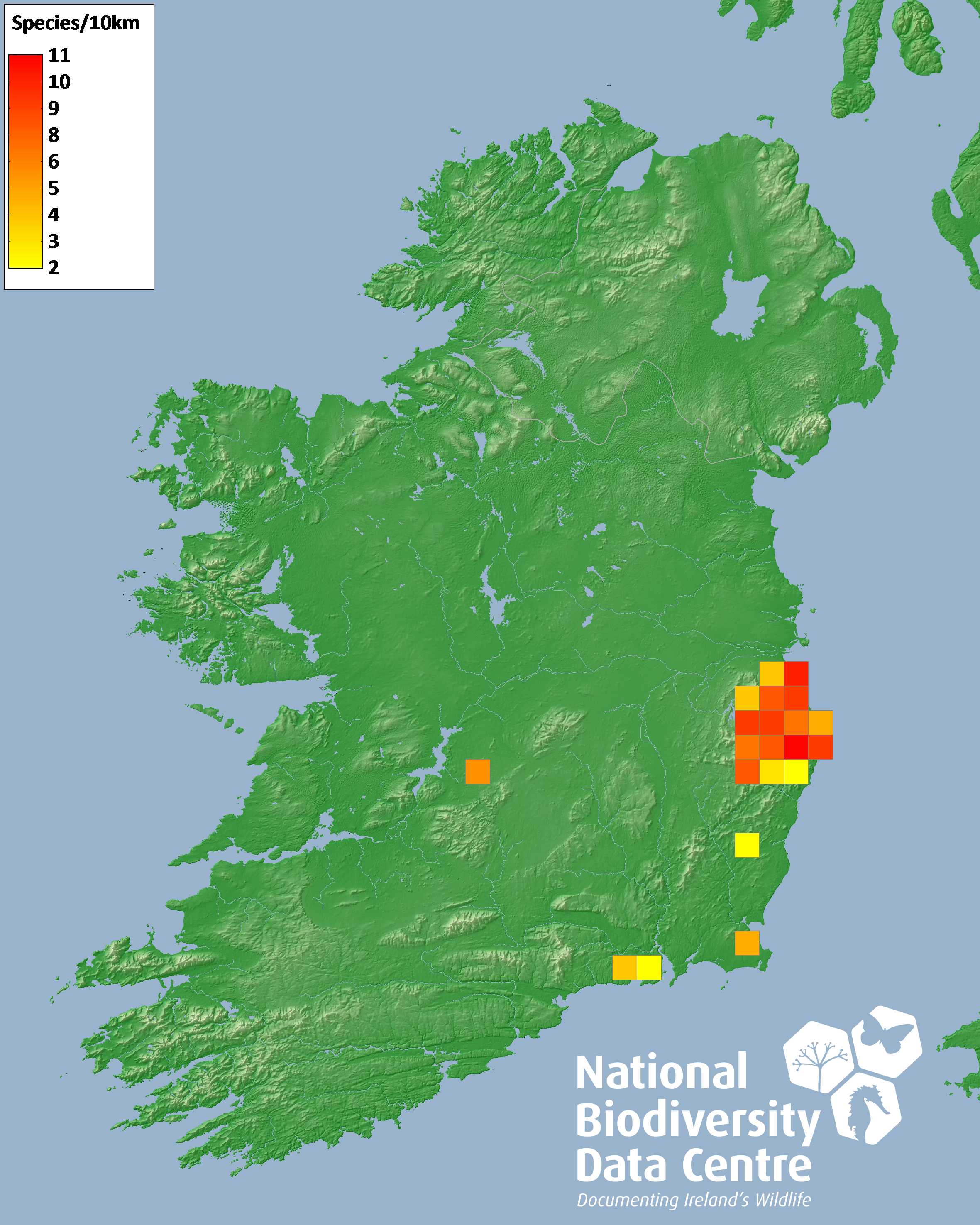 Distribution of the number of species recorded within each 10km grid square (ITM).Marine Map - 50Km