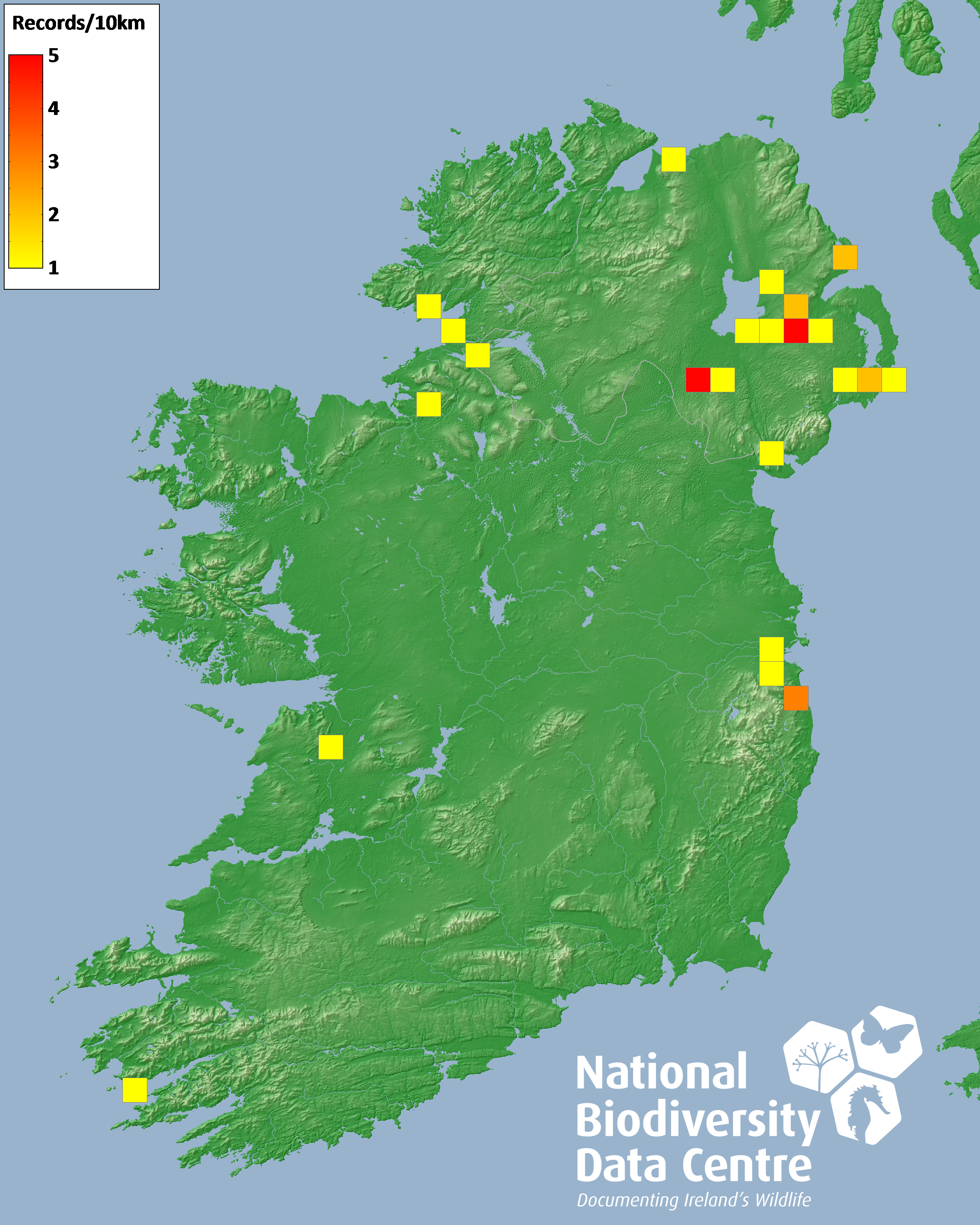 Distribution of the number of records recorded within each 10km grid square (ITM).Marine Map - 50km