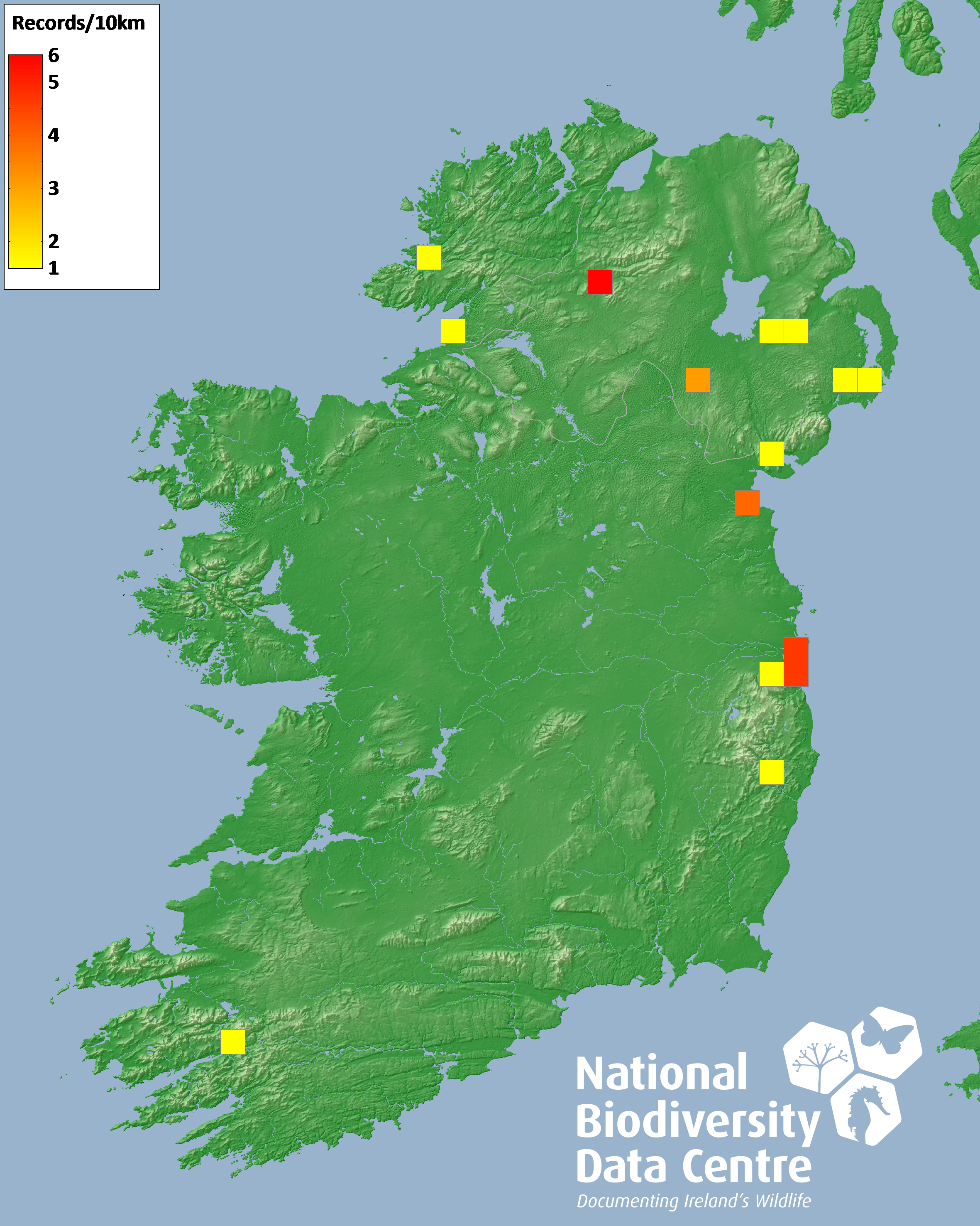 Distribution of the number of records recorded within each 10km grid square (ITM).Marine Map - 50km
