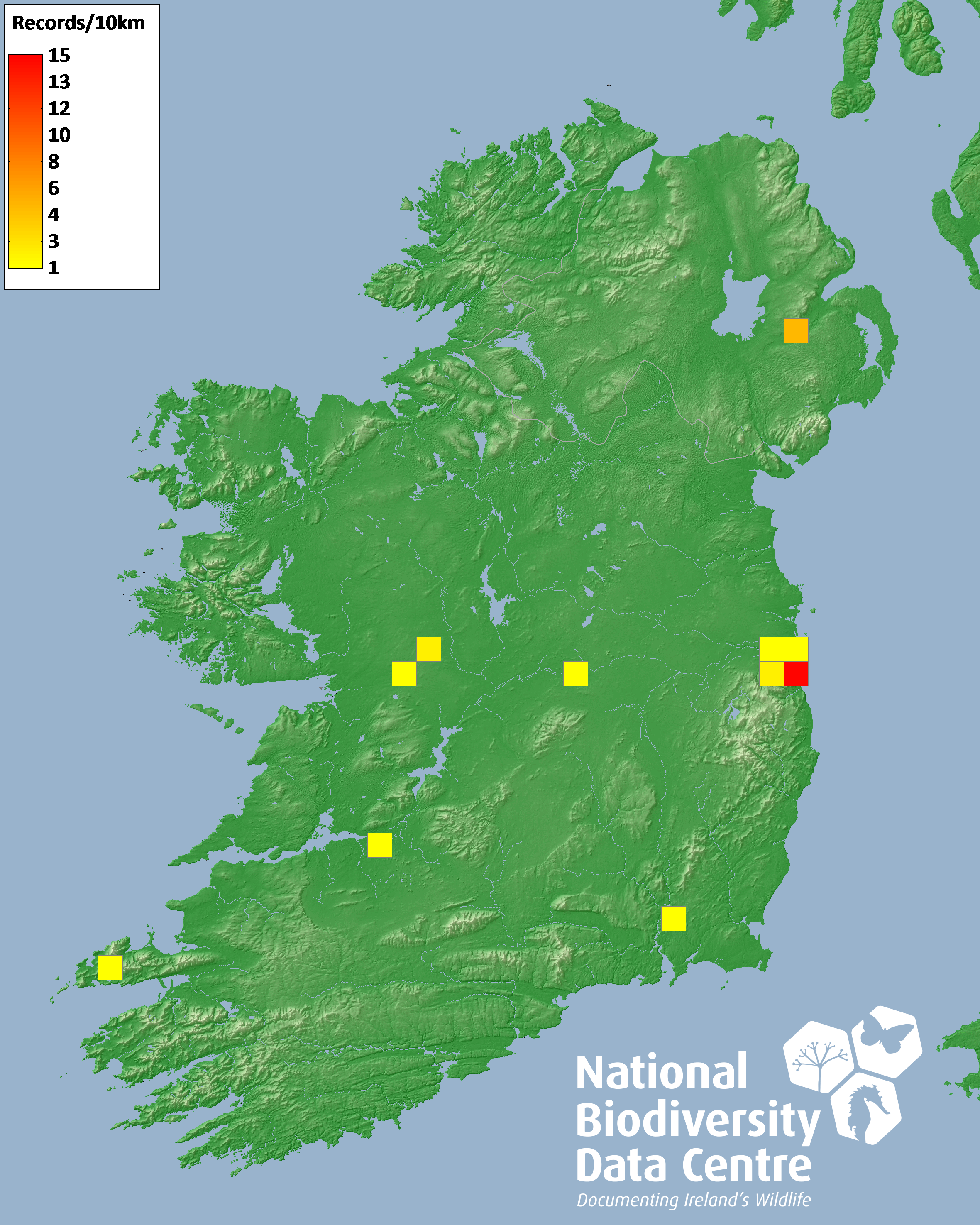 Distribution of the number of records recorded within each 10km grid square (ITM).Marine Map - 50km