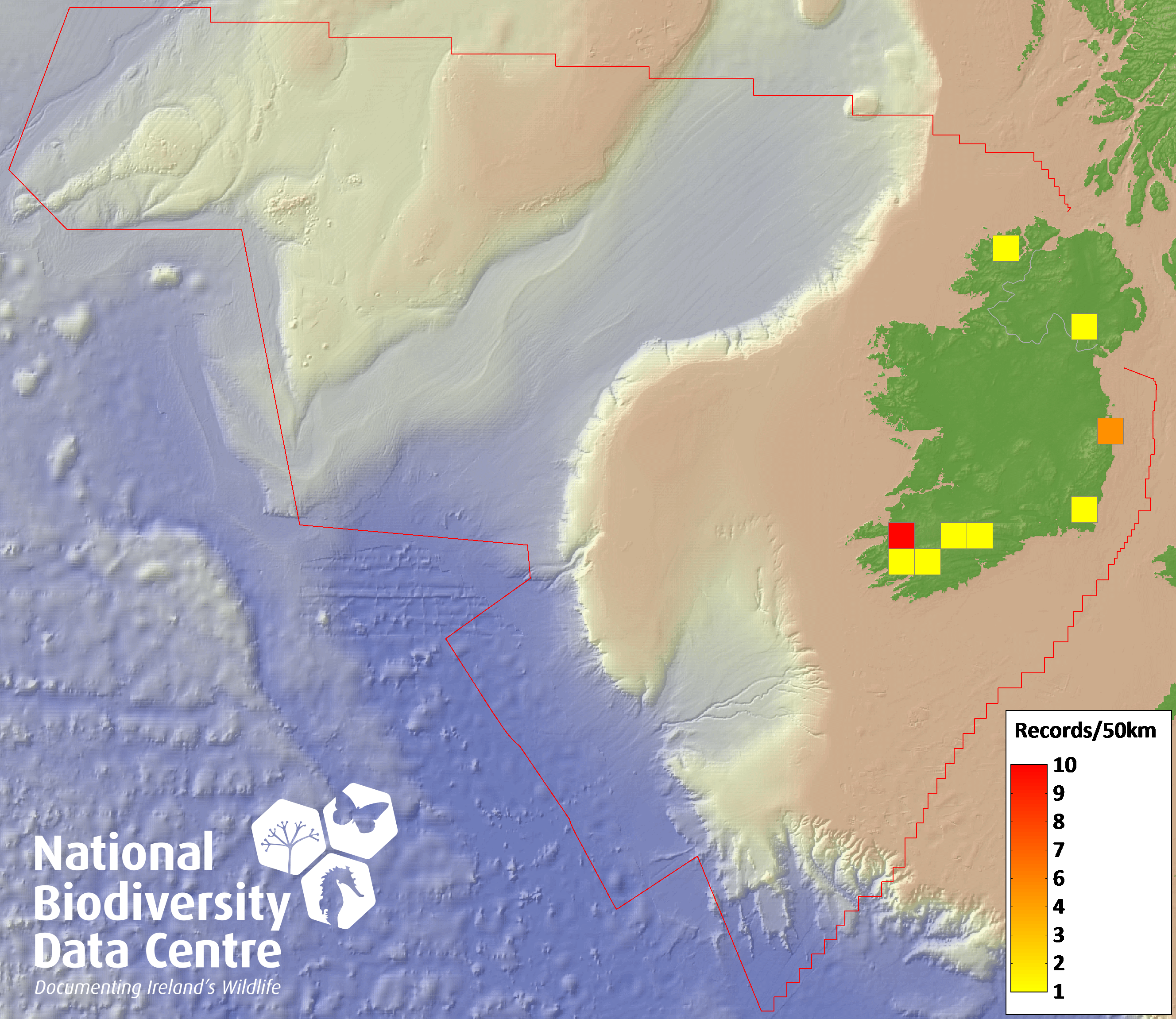 Distribution of the number of records recorded within each 10km grid square (ITM).Marine Map - 50km
