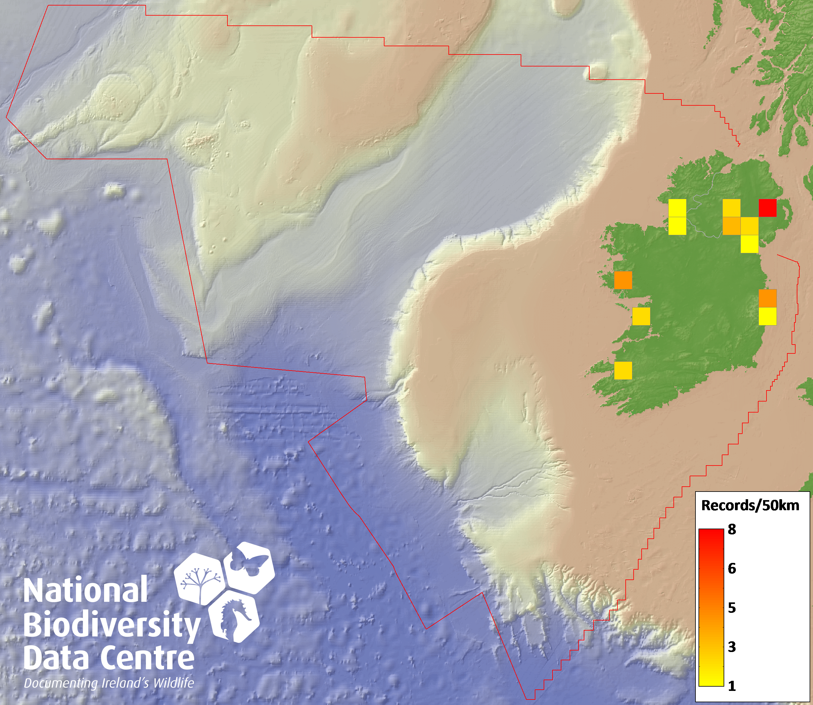 Distribution of the number of records recorded within each 10km grid square (ITM).Marine Map - 50km