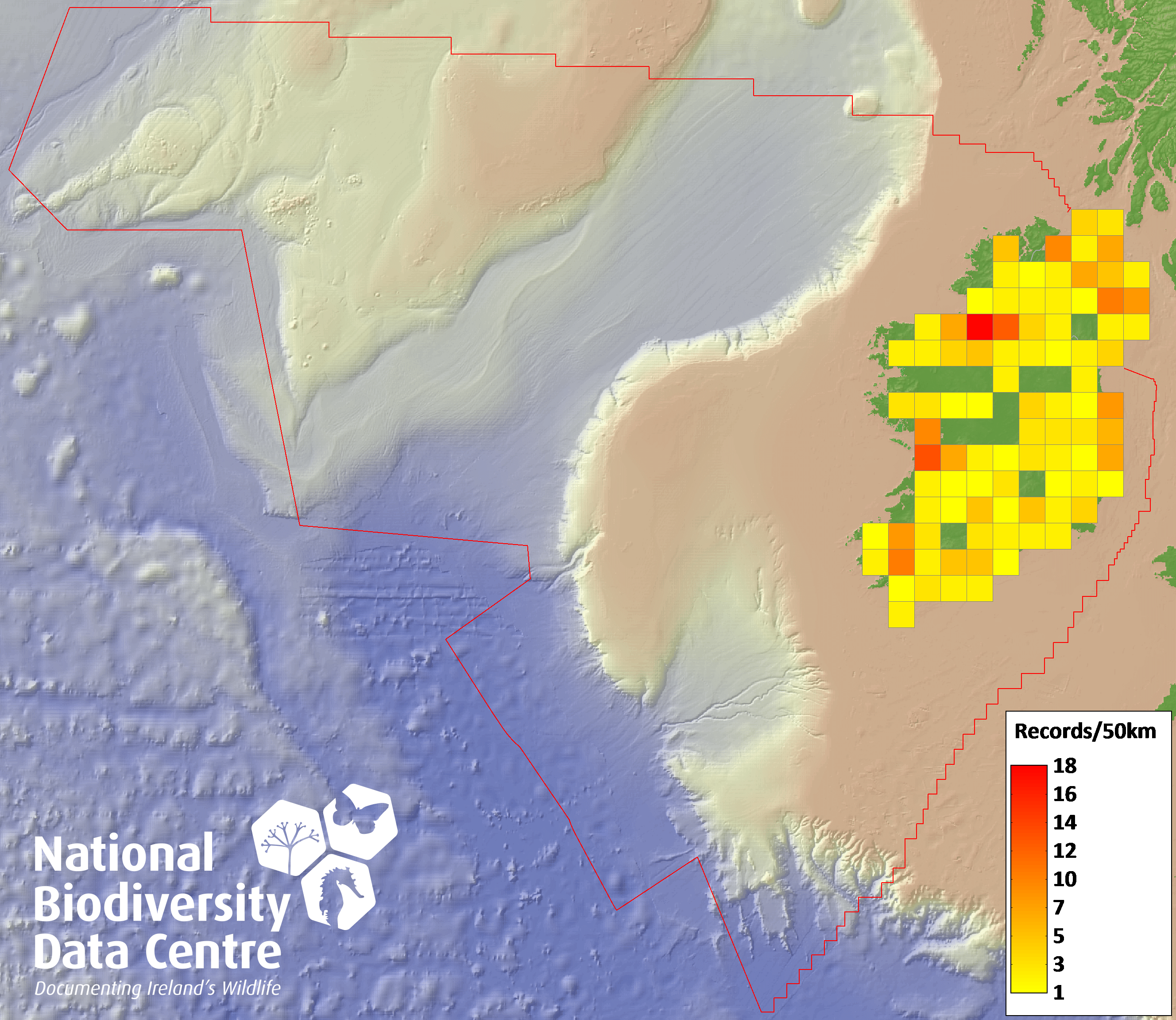 Distribution of the number of records recorded within each 10km grid square (ITM).Marine Map - 50km