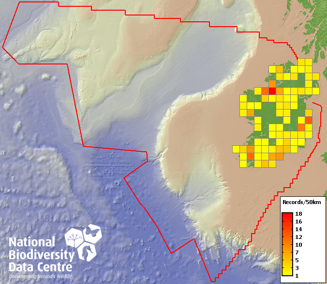 Distribution of the number of records recorded within each 10km grid square (ITM).Marine Map - 50km