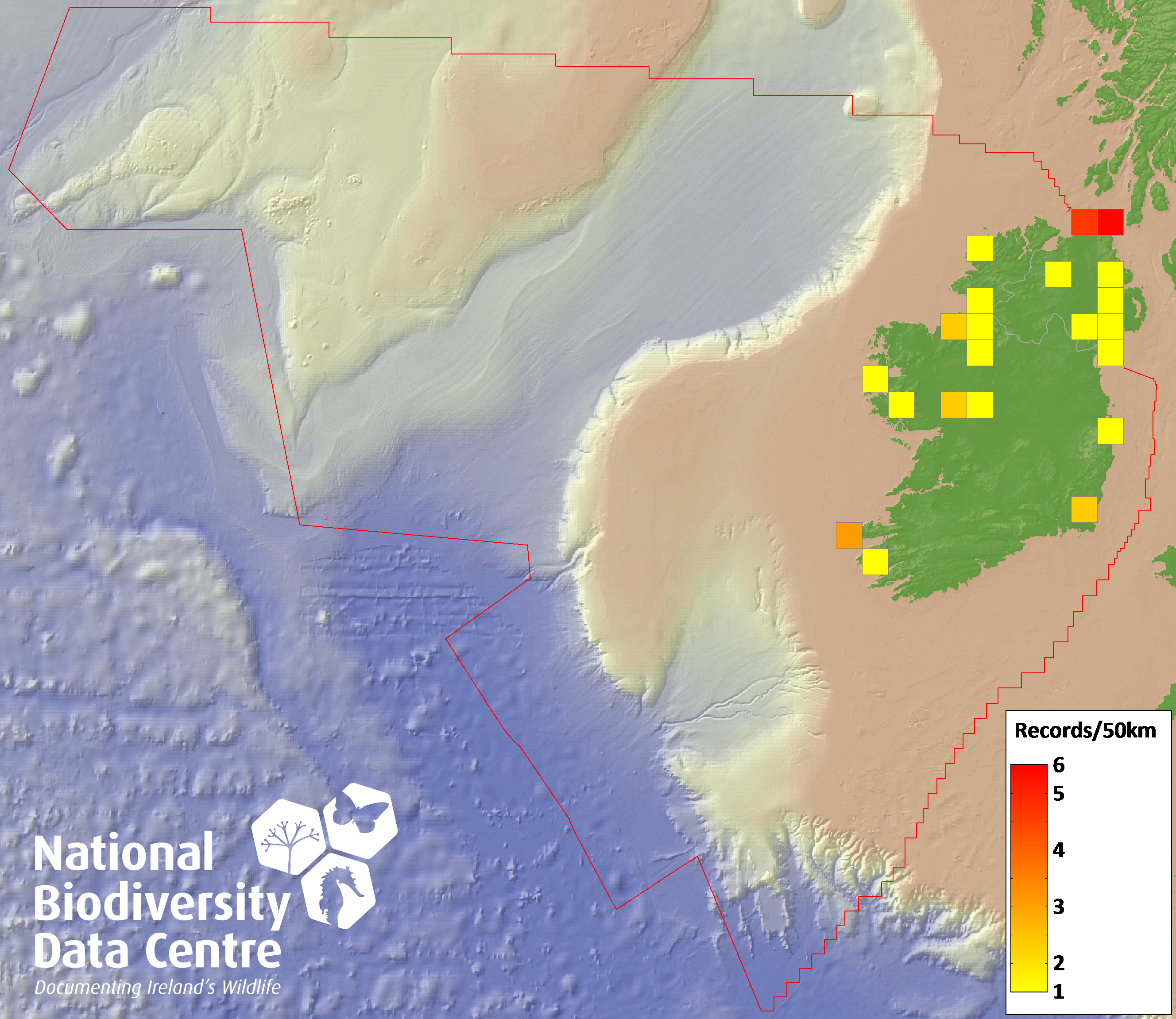 Distribution of the number of records recorded within each 10km grid square (ITM).Marine Map - 50km