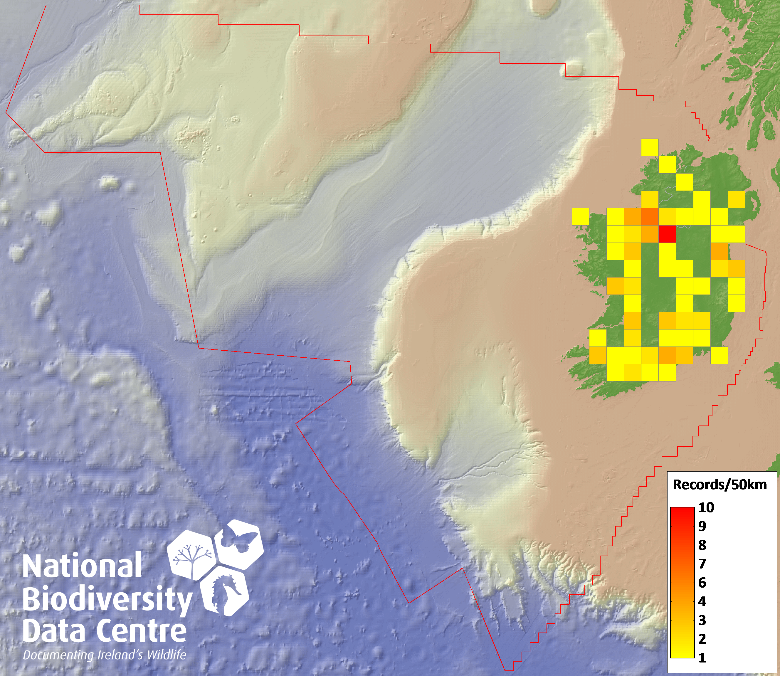 Distribution of the number of records recorded within each 10km grid square (ITM).Marine Map - 50km