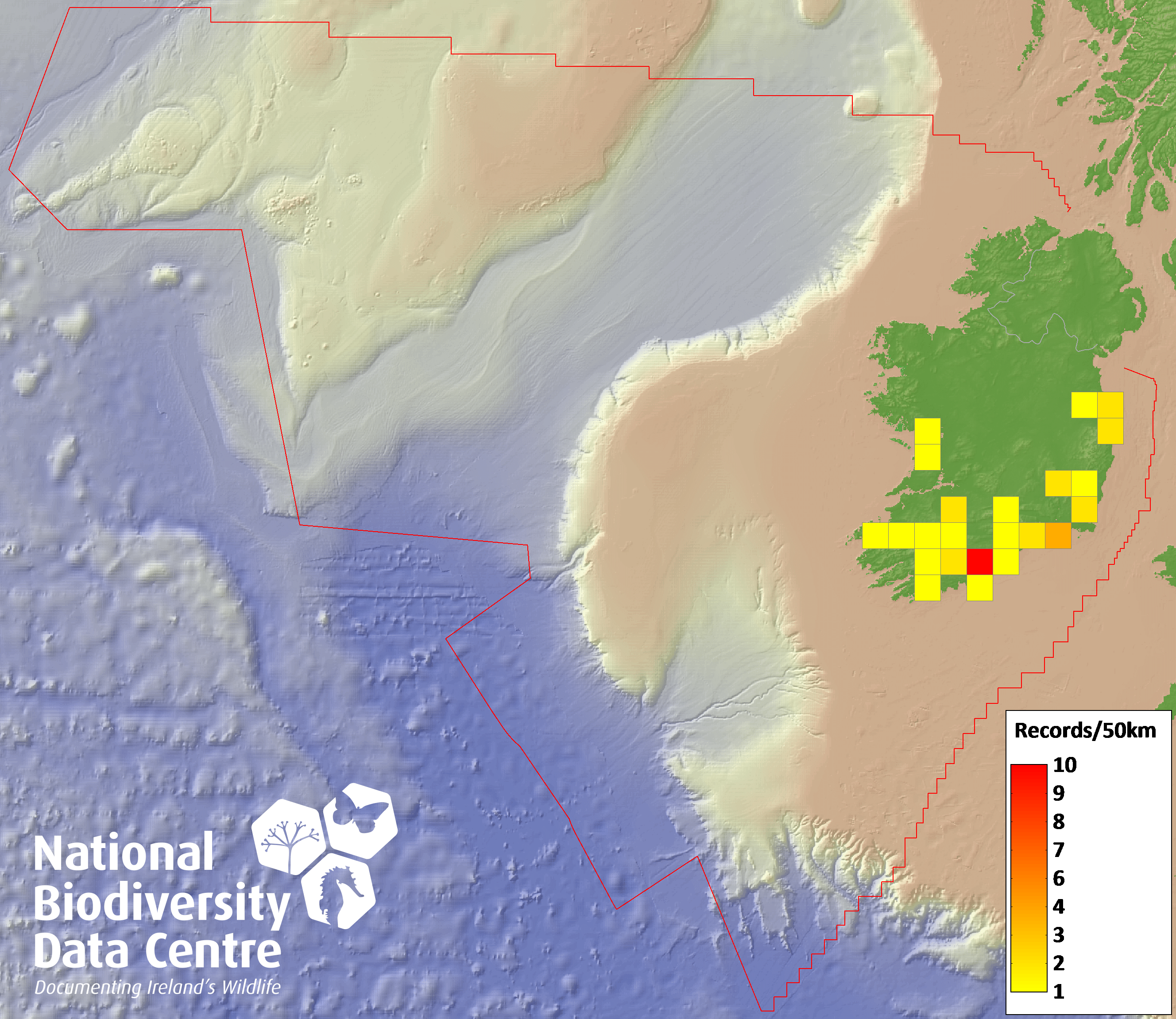Distribution of the number of records recorded within each 10km grid square (ITM).Marine Map - 50km