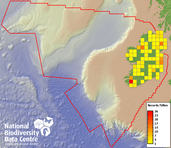 Distribution of the number of records within each 10km grid square (ITM).Marine Map - 50Km