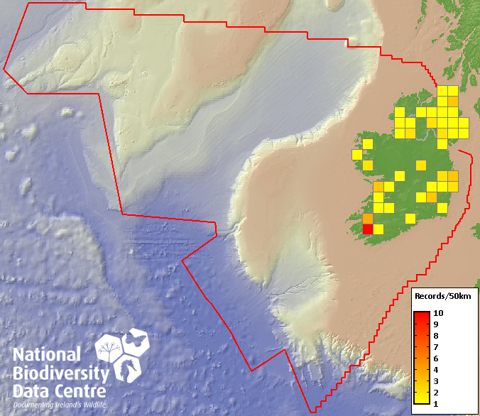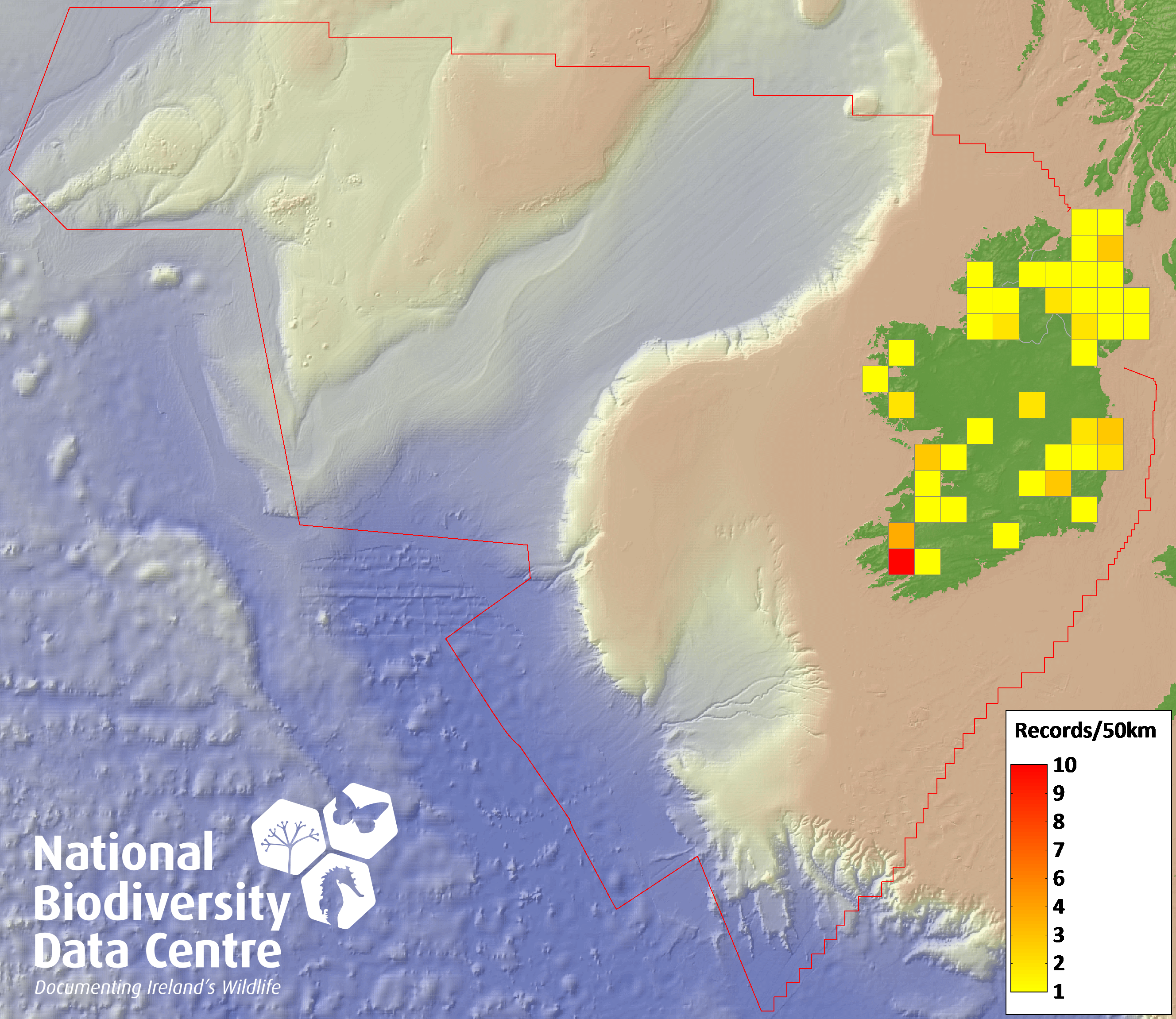 Distribution of the number of records recorded within each 10km grid square (ITM).Marine Map - 50km