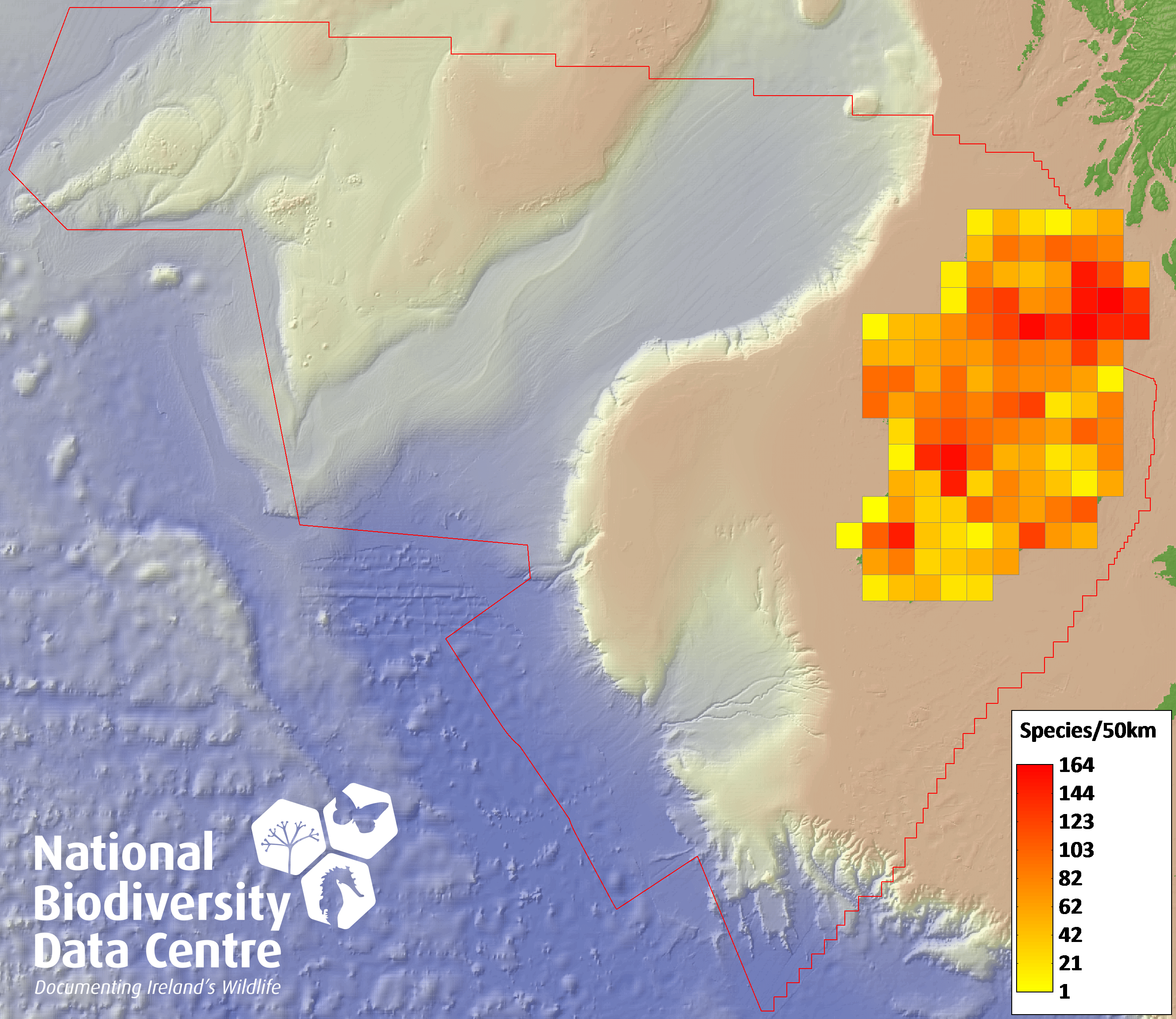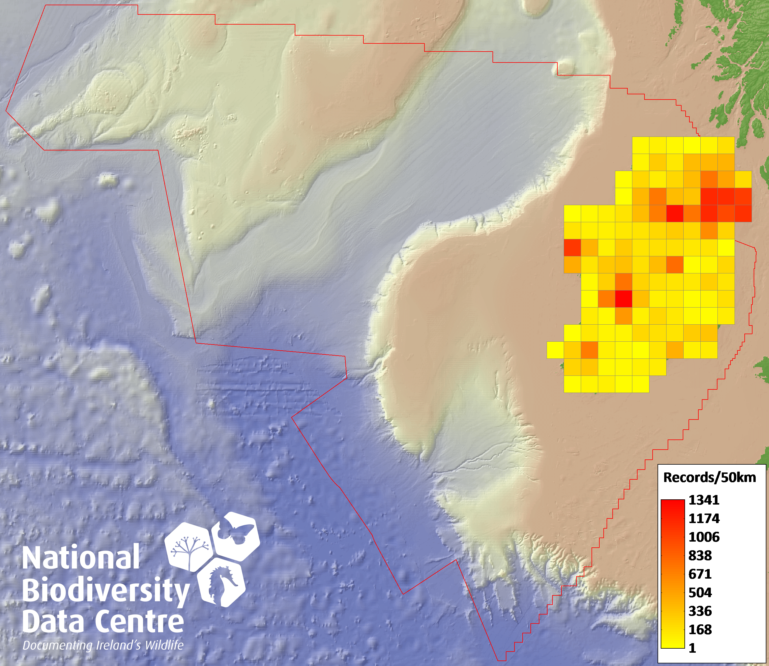 Distribution of the number of records within each 10km grid square (ITM).Marine Map - 50Km
