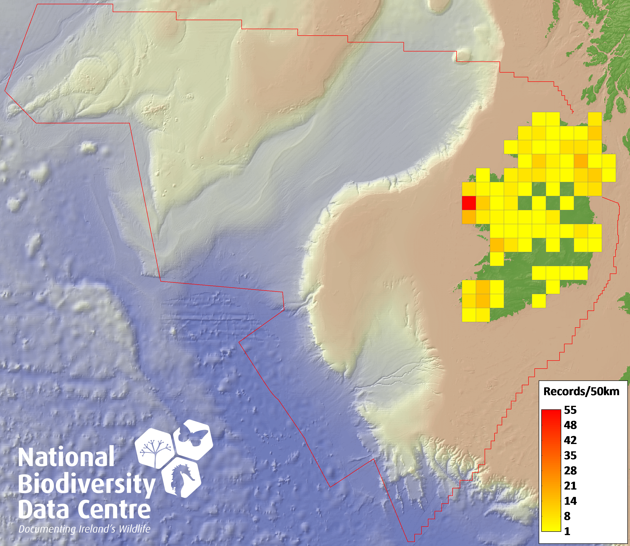 Distribution of the number of records recorded within each 10km grid square (ITM).Marine Map - 50km