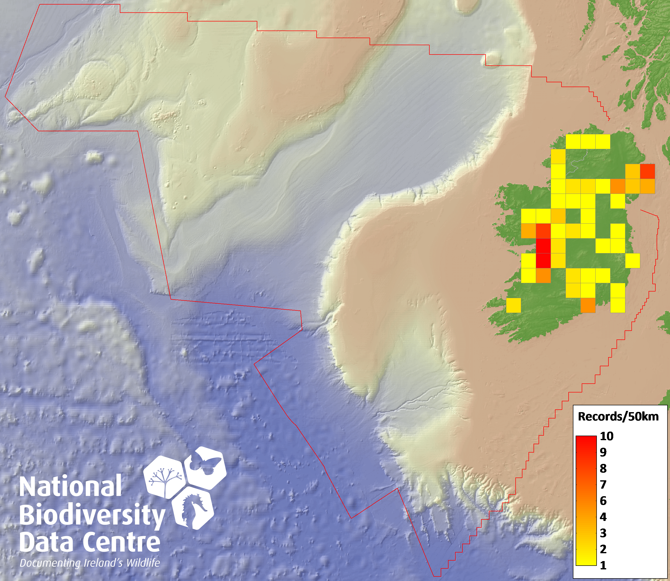 Distribution of the number of records recorded within each 10km grid square (ITM).Marine Map - 50km