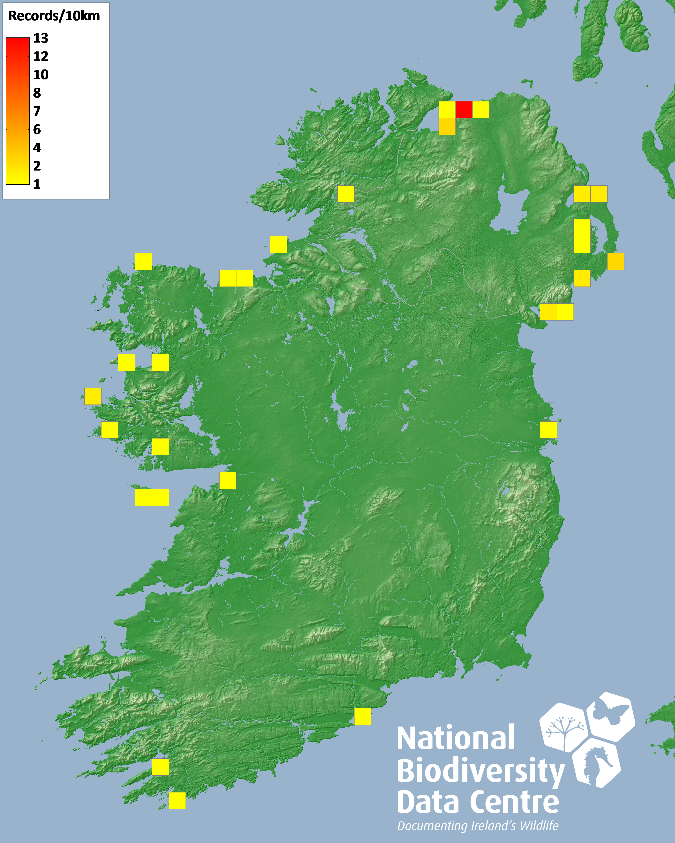 Distribution of the number of records recorded within each 10km grid square (ITM).Marine Map - 50km