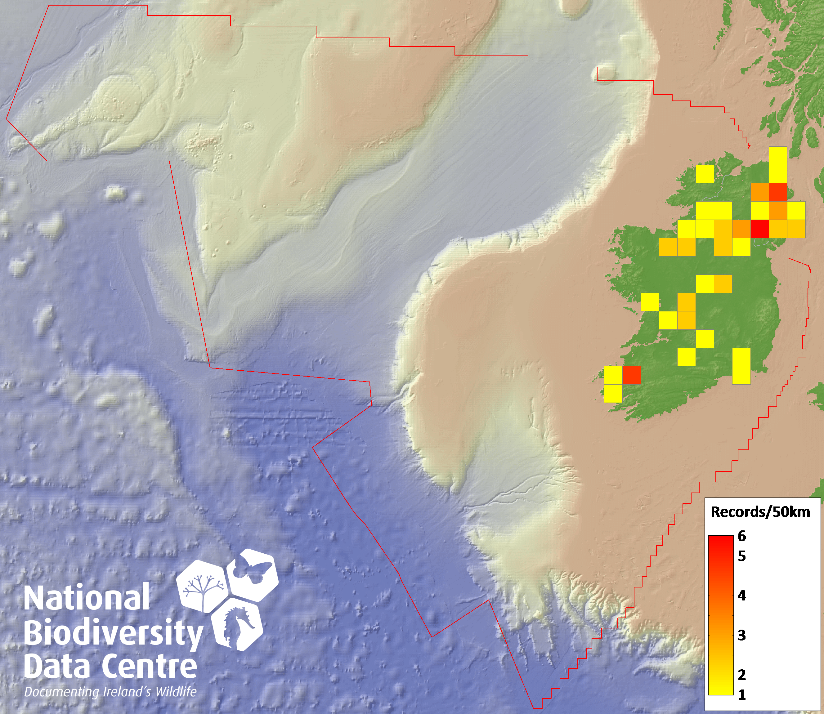 Distribution of the number of records recorded within each 10km grid square (ITM).Marine Map - 50km