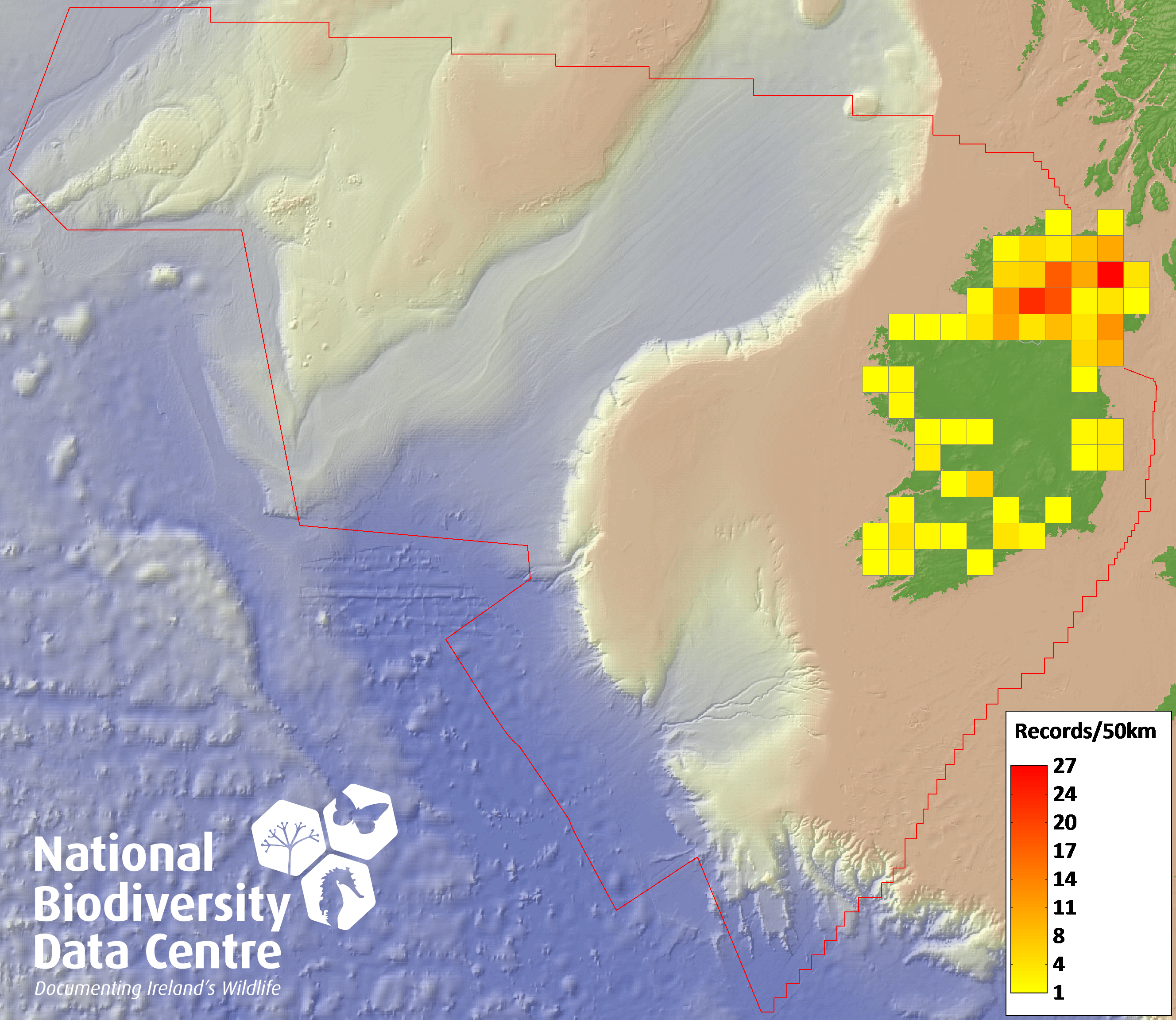 Distribution of the number of records recorded within each 10km grid square (ITM).Marine Map - 50km