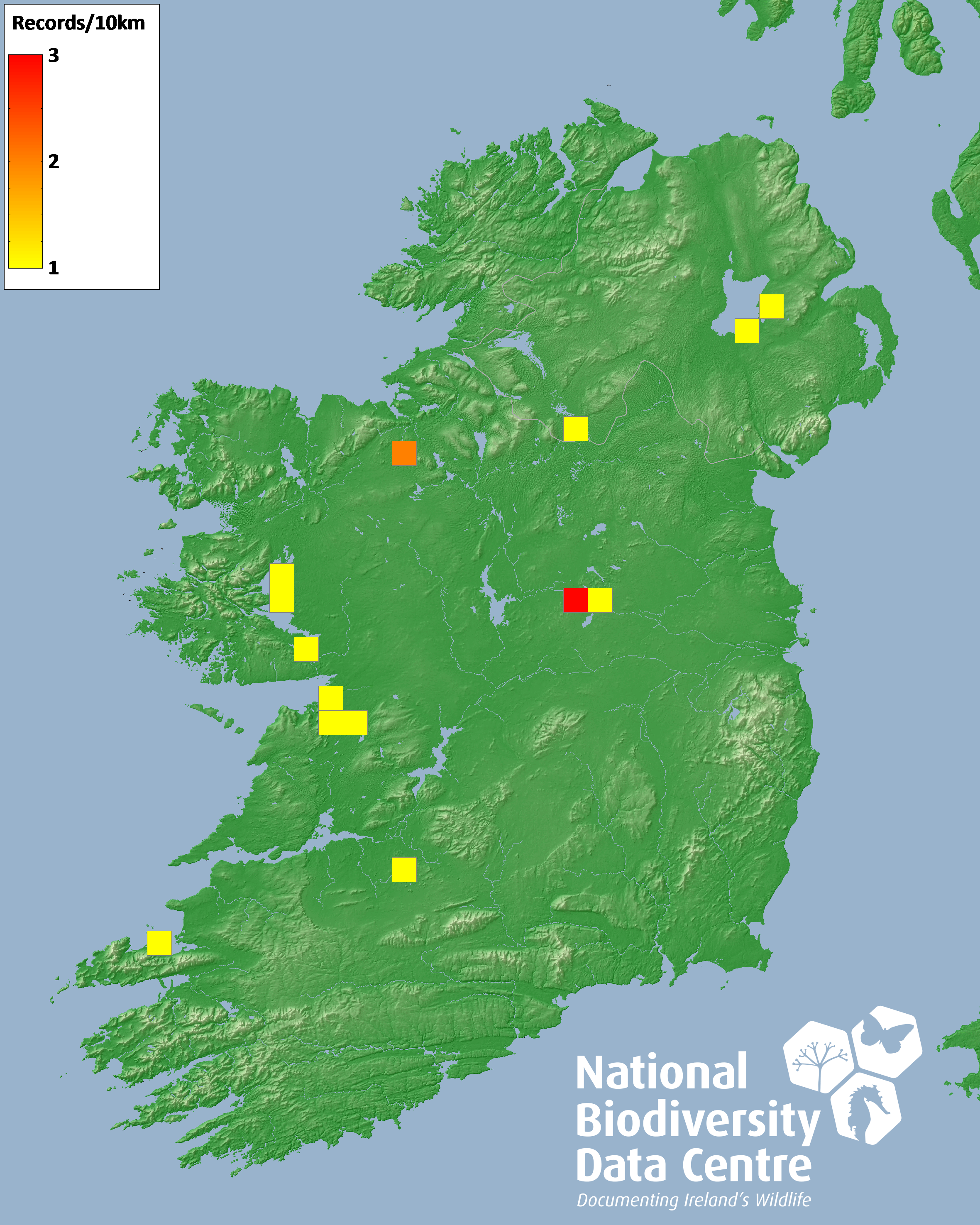 Distribution of the number of records recorded within each 10km grid square (ITM).Marine Map - 50km