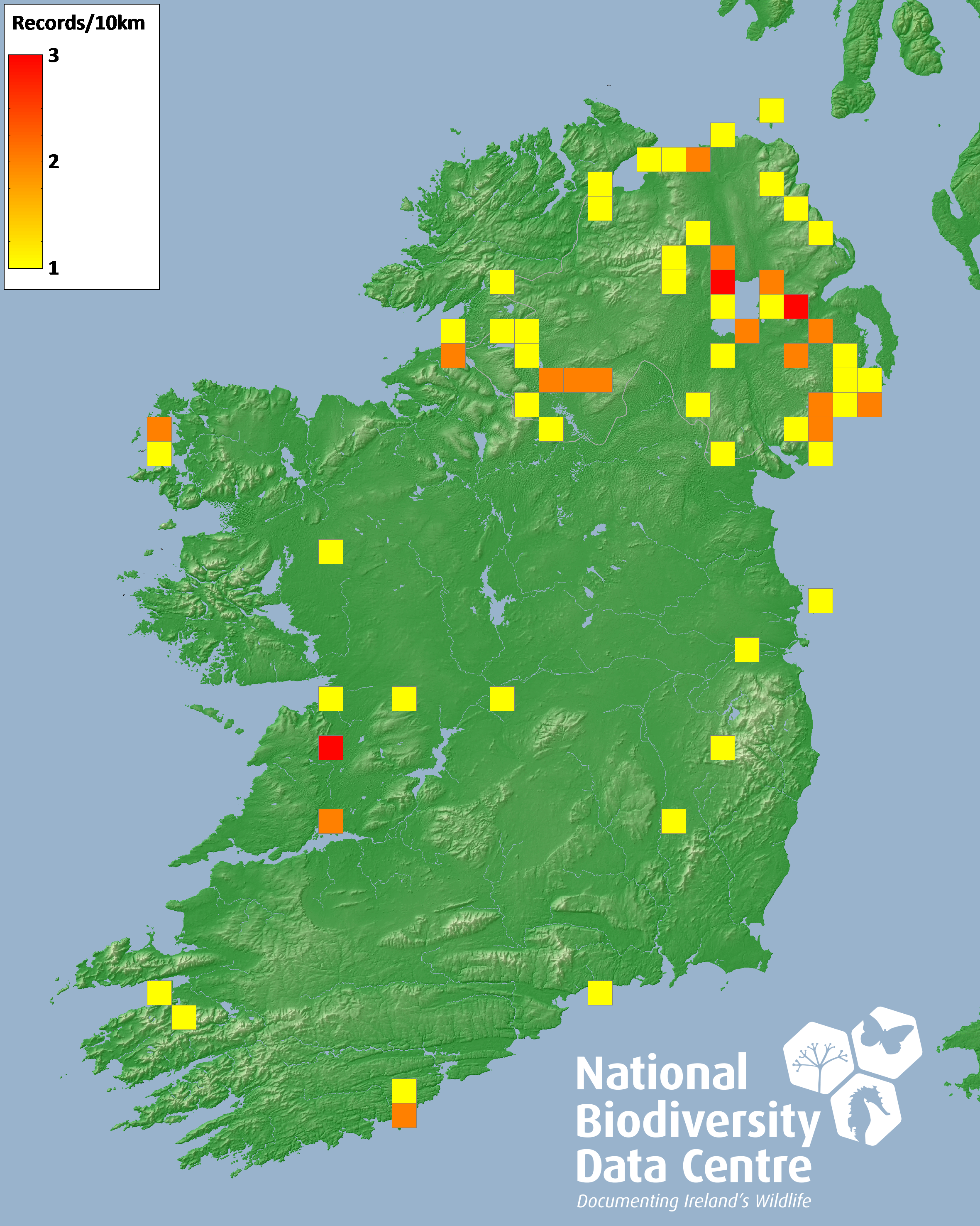 Distribution of the number of records recorded within each 10km grid square (ITM).Marine Map - 50km