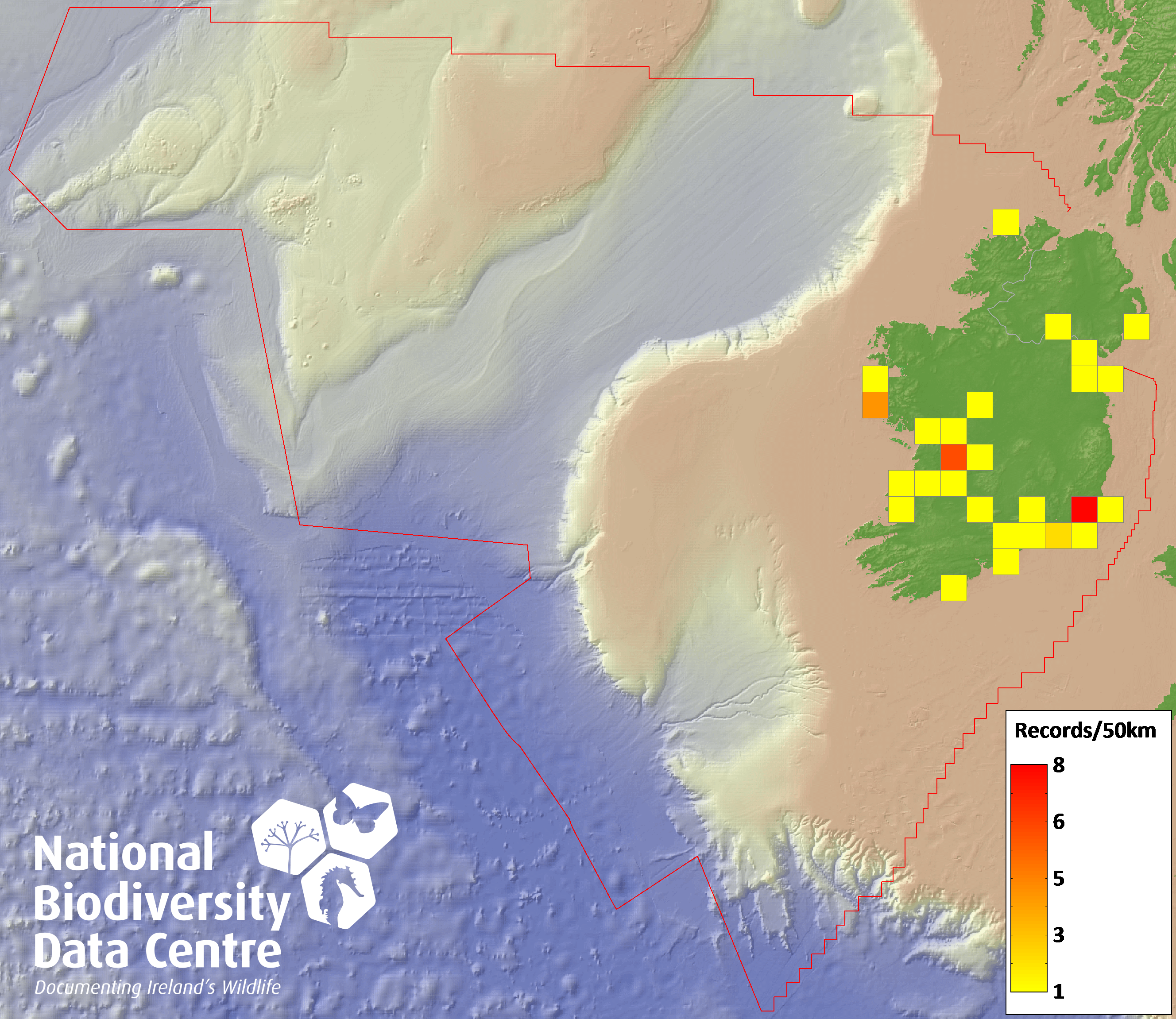 Distribution of the number of records recorded within each 10km grid square (ITM).Marine Map - 50km