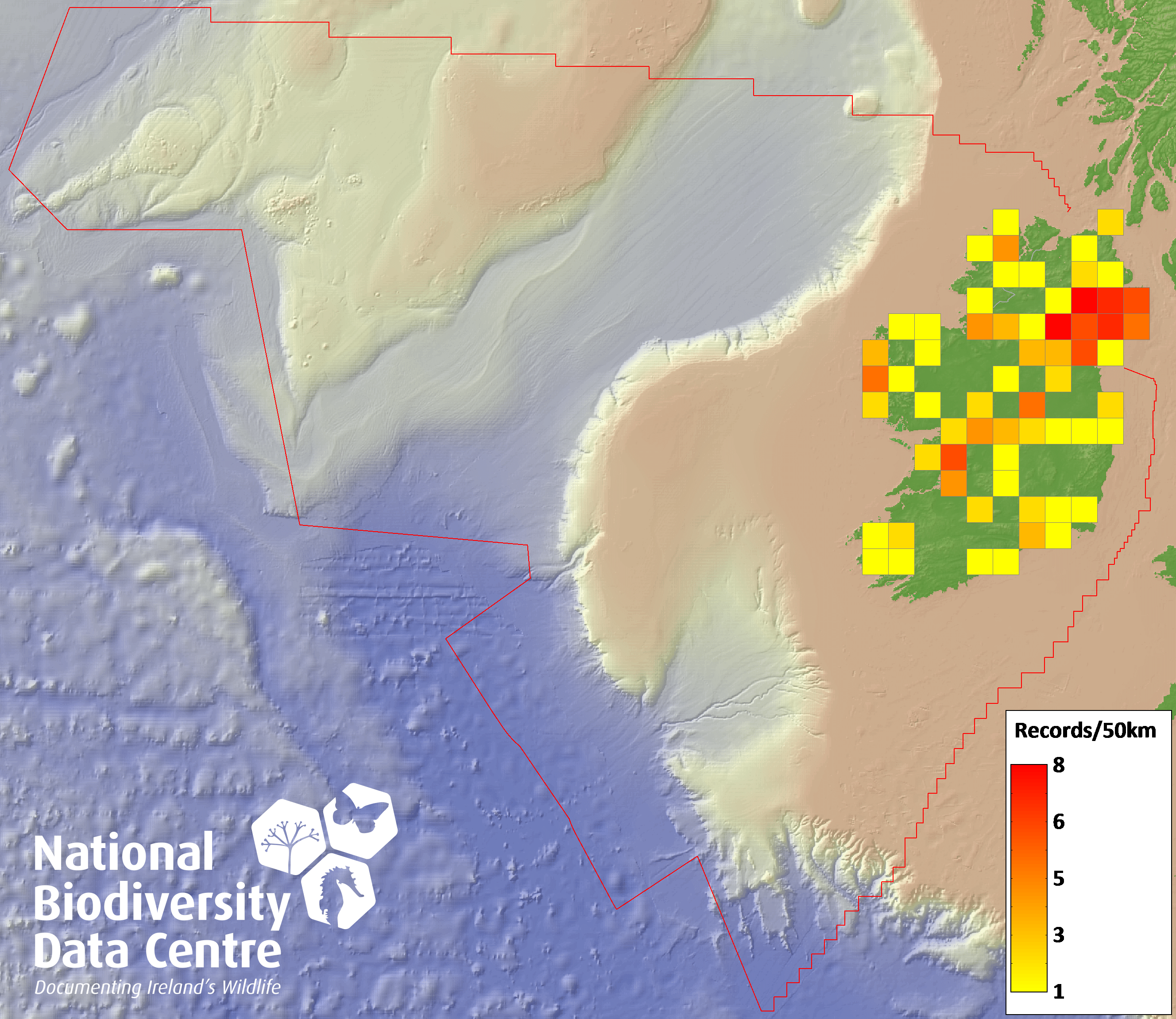Distribution of the number of records recorded within each 10km grid square (ITM).Marine Map - 50km