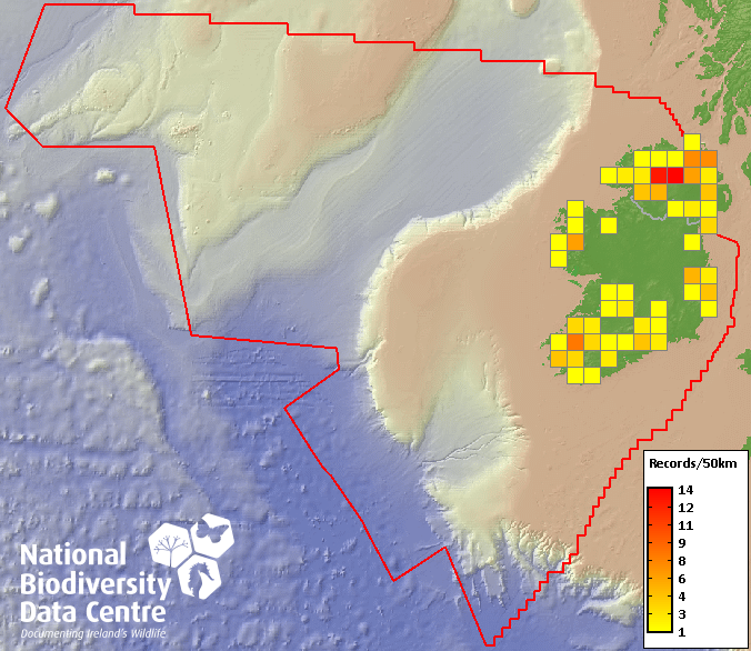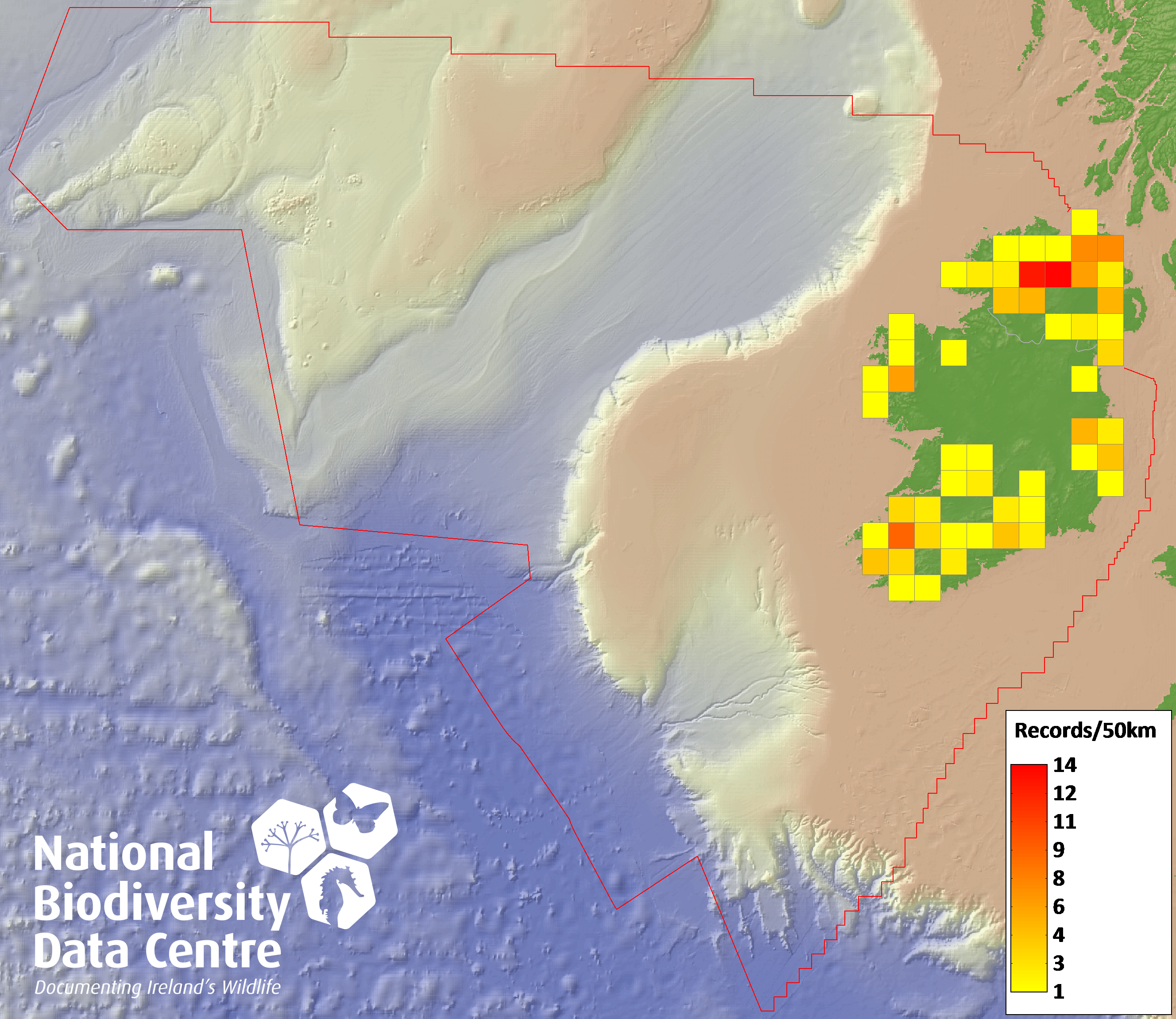 Distribution of the number of records recorded within each 10km grid square (ITM).Marine Map - 50km