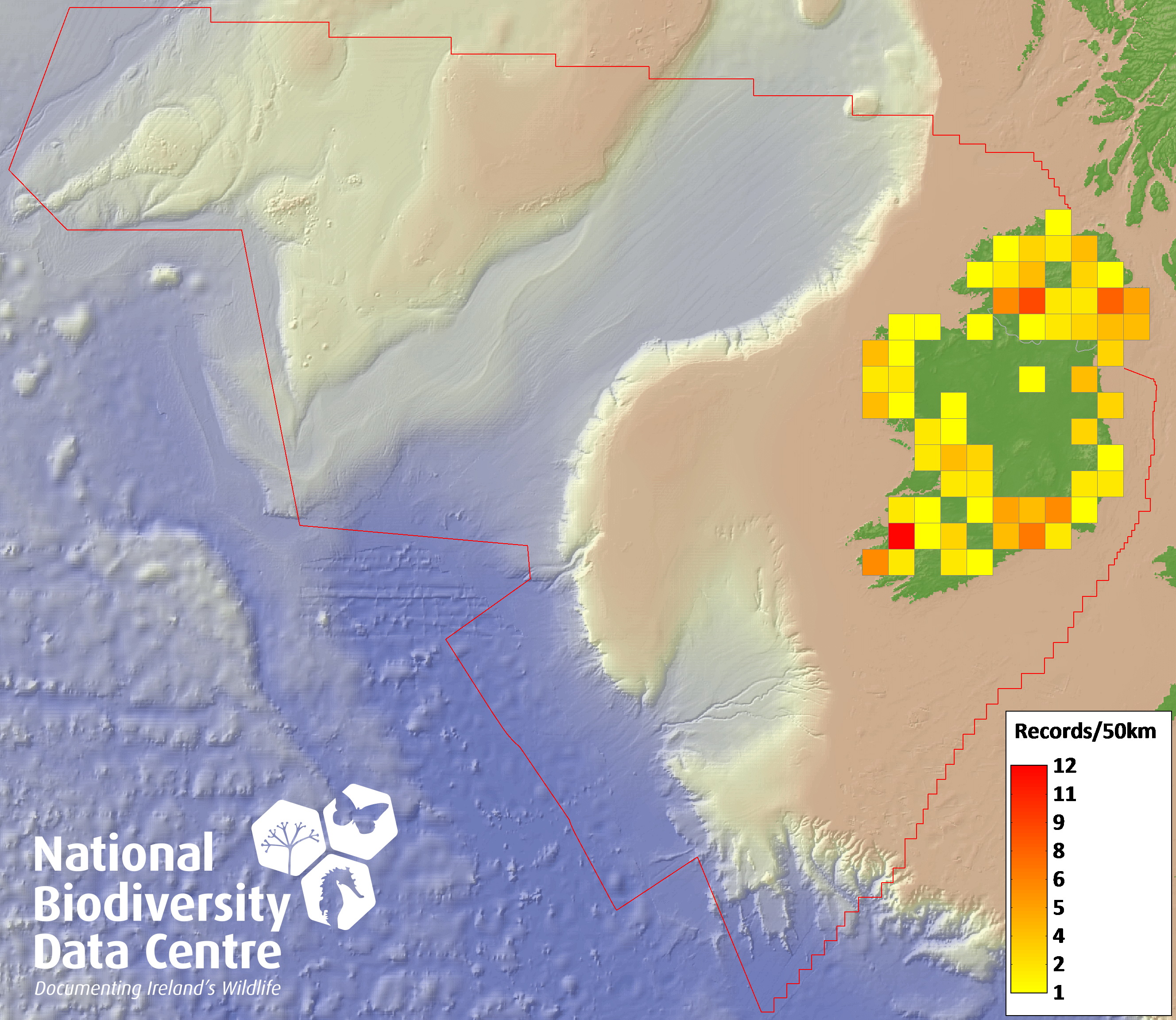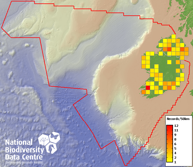 Distribution of the number of records recorded within each 10km grid square (ITM).Marine Map - 50km