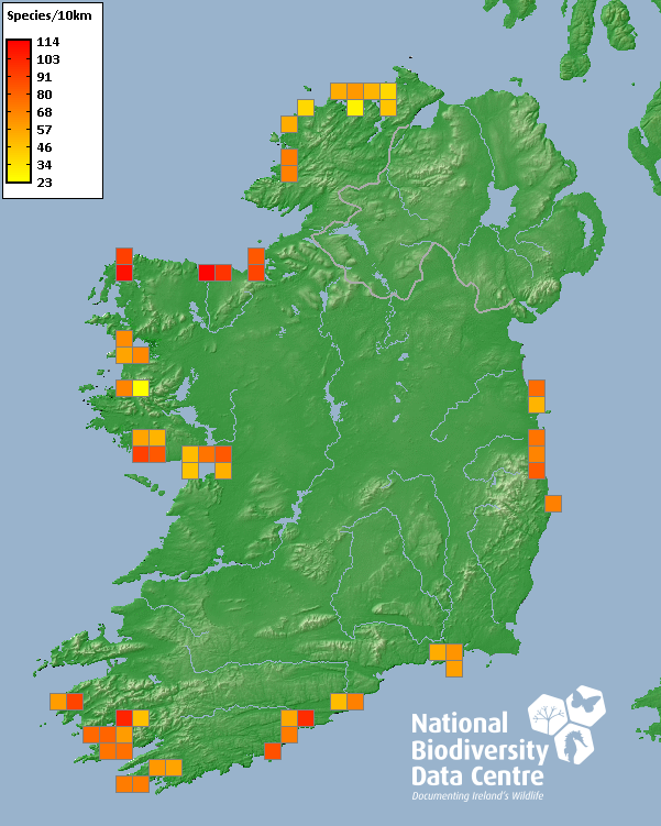 Distribution of the number of species recorded within each 10km grid square (ITM).Marine Map - 50Km