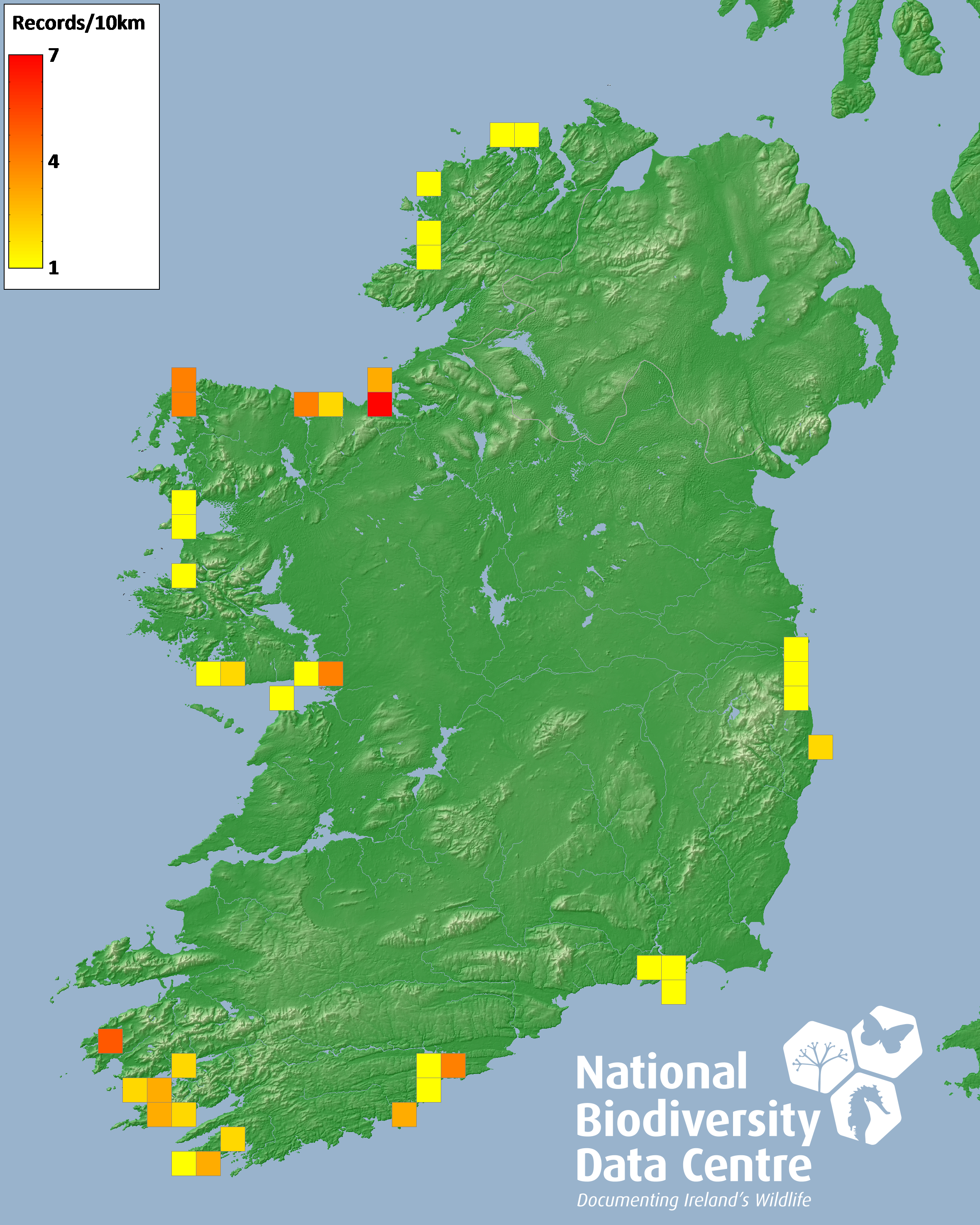 Distribution of the number of records recorded within each 10km grid square (ITM).Marine Map - 50km