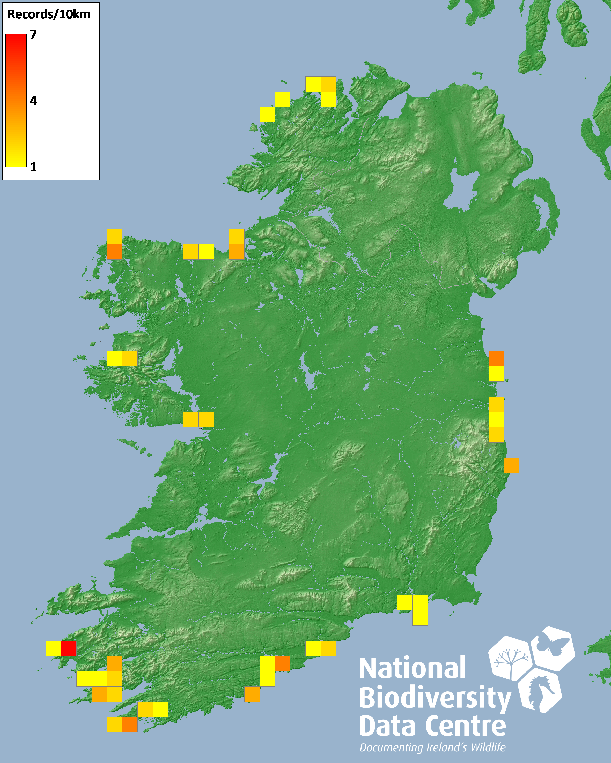 Distribution of the number of records recorded within each 10km grid square (ITM).Marine Map - 50km