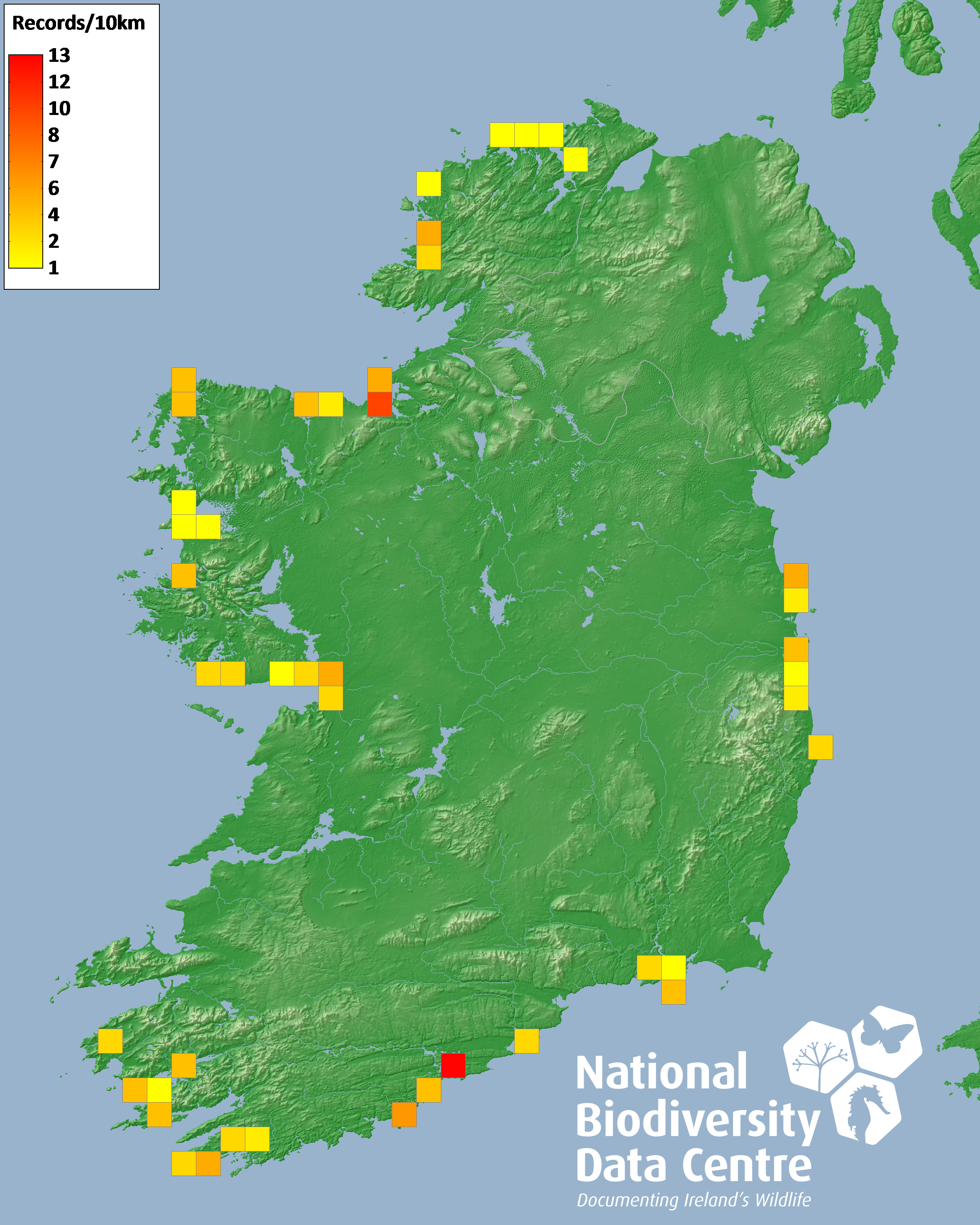 Distribution of the number of records recorded within each 10km grid square (ITM).Marine Map - 50km
