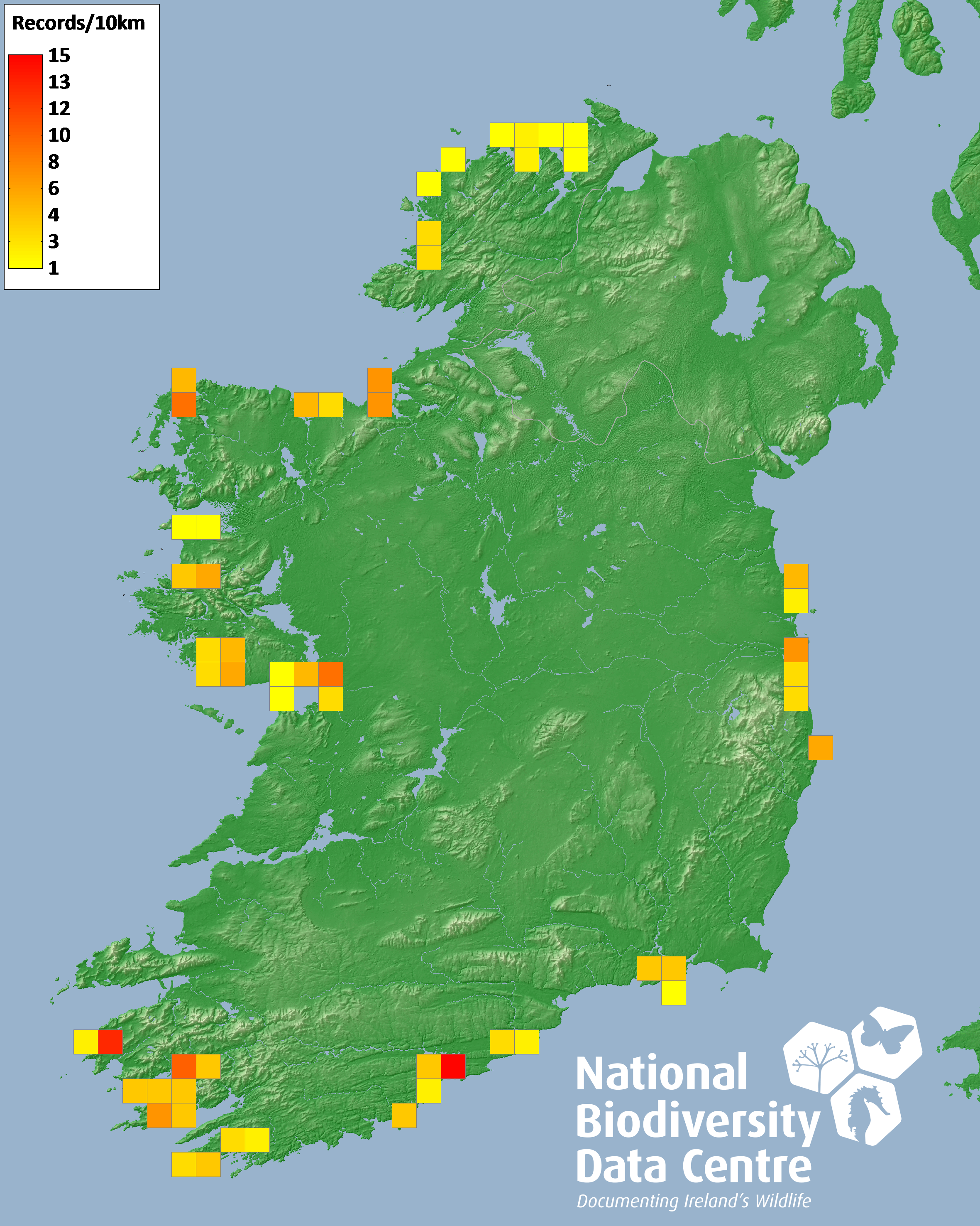 Distribution of the number of records recorded within each 10km grid square (ITM).Marine Map - 50km