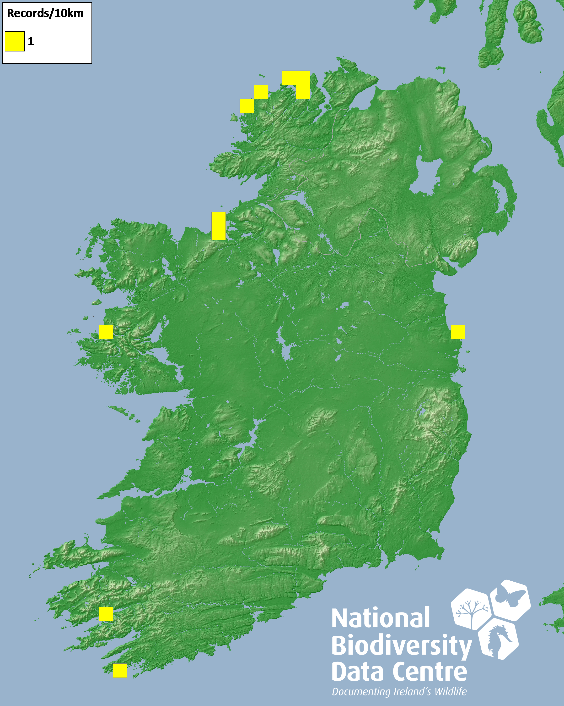 Distribution of the number of records recorded within each 10km grid square (ITM).Marine Map - 50km