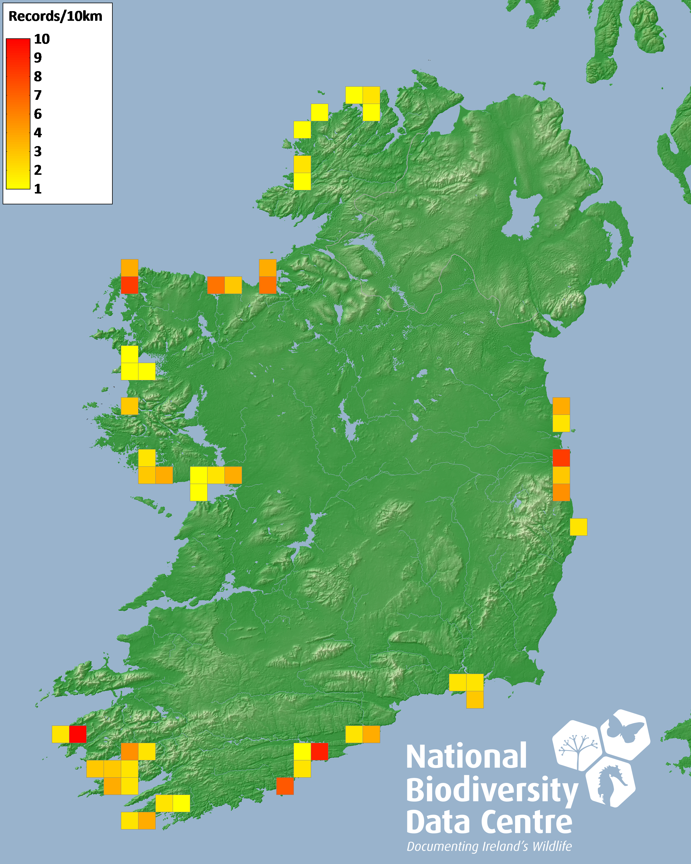 Distribution of the number of records recorded within each 10km grid square (ITM).Marine Map - 50km