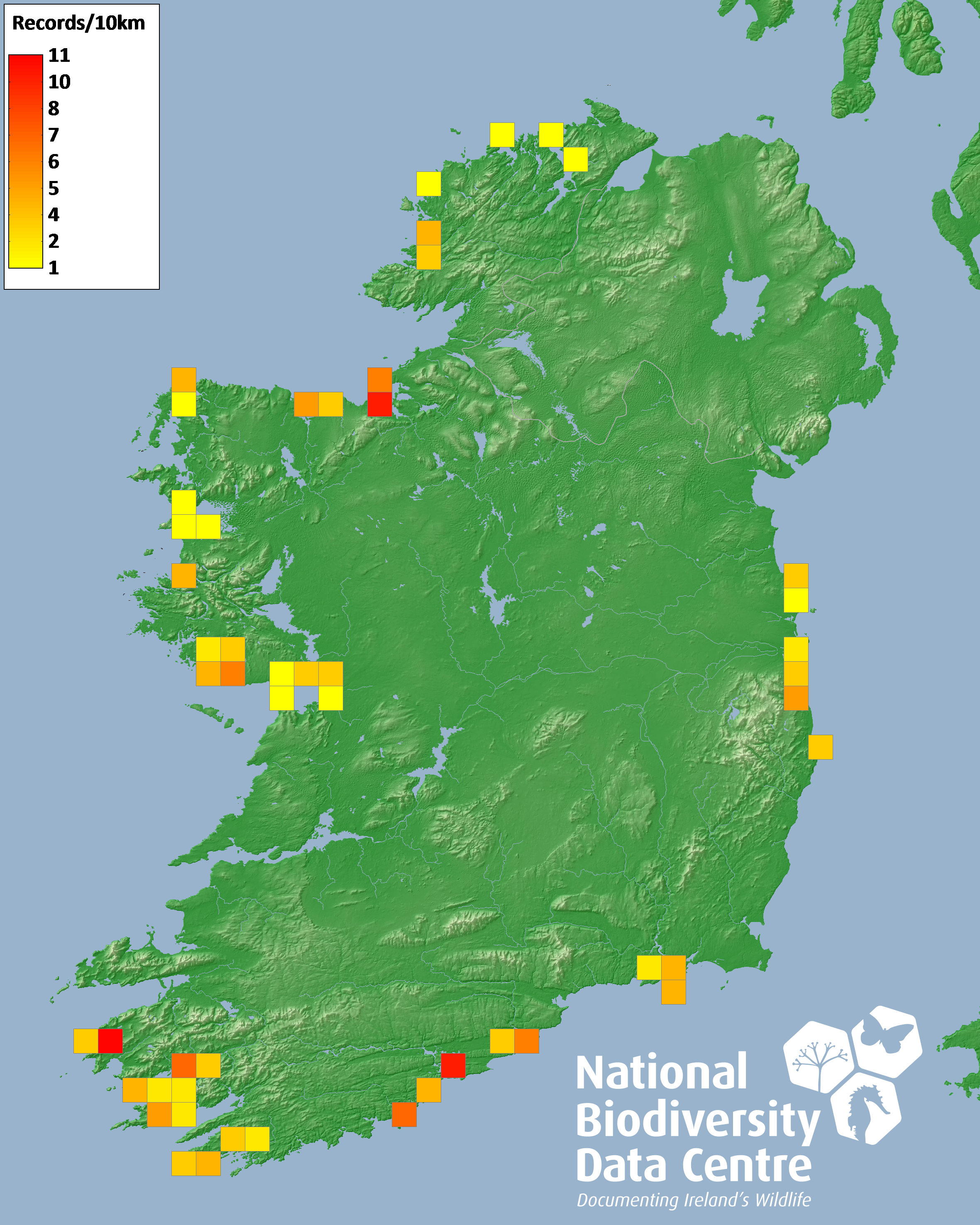 Distribution of the number of records recorded within each 10km grid square (ITM).Marine Map - 50km