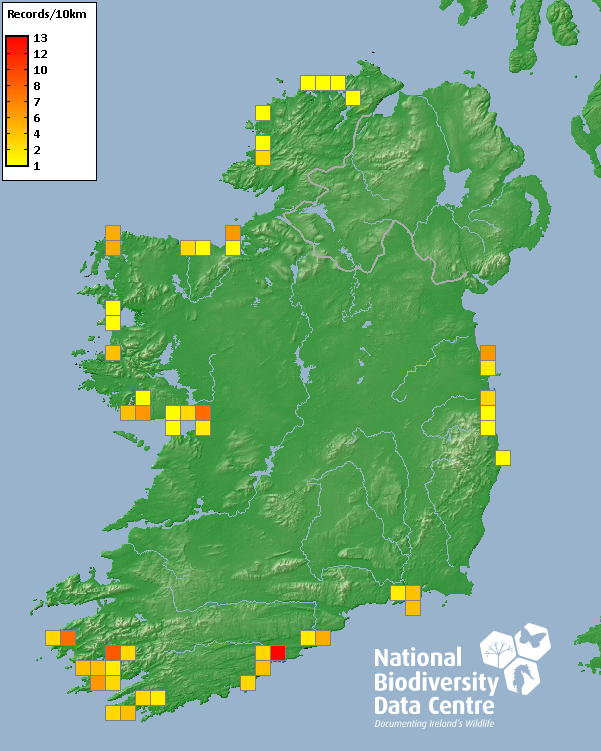Distribution of the number of records recorded within each 10km grid square (ITM).Marine Map - 50km