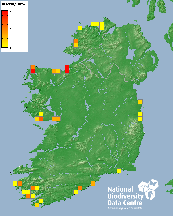 Distribution of the number of records recorded within each 10km grid square (ITM).Marine Map - 50km