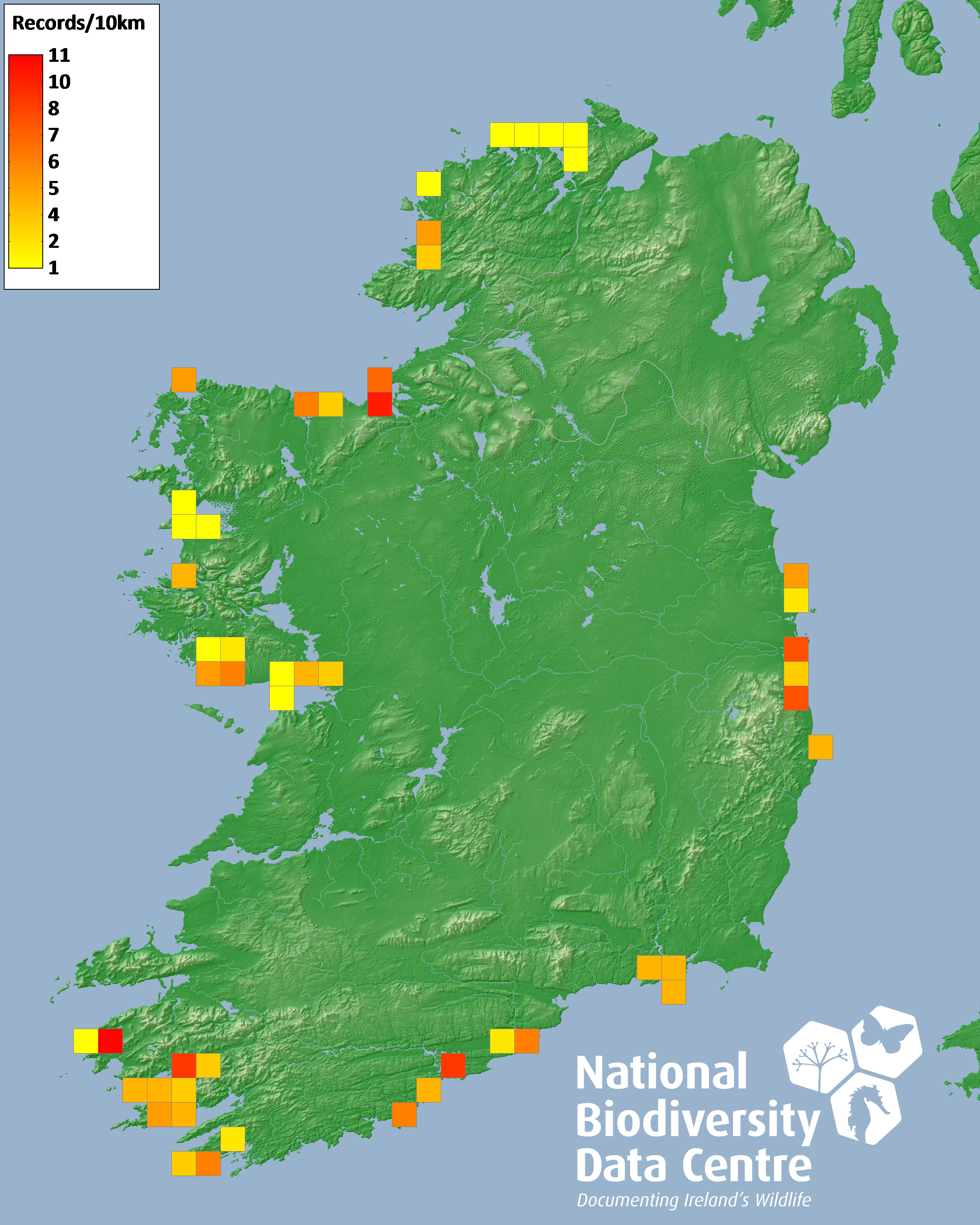 Distribution of the number of records recorded within each 10km grid square (ITM).Marine Map - 50km